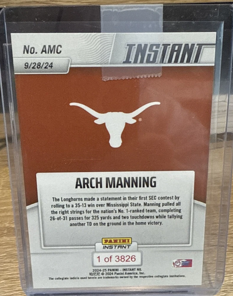 This 2024 Panini Instant NIL Arch Manning Rookie RC #AMC trading card is a must-have for any avid collector. Featuring the talented quarterback for the Texas Longhorns, this card is an original and licensed print with a print run of 3826. The card is made of high-quality paper with a thickness of 35 Pt. and is part of the base set and rookie features. The card is in standard size and was manufactured in the United States by Panini in 2024. It is a National Collegiate Athletic Association (NCAA) licensed product and is perfect for fans of football and the Texas Longhorns. The card name is "Manning, Texas Dominant In SEC Debut" and it is a great addition to any sports trading card collection.