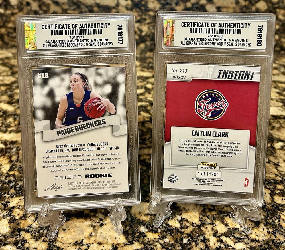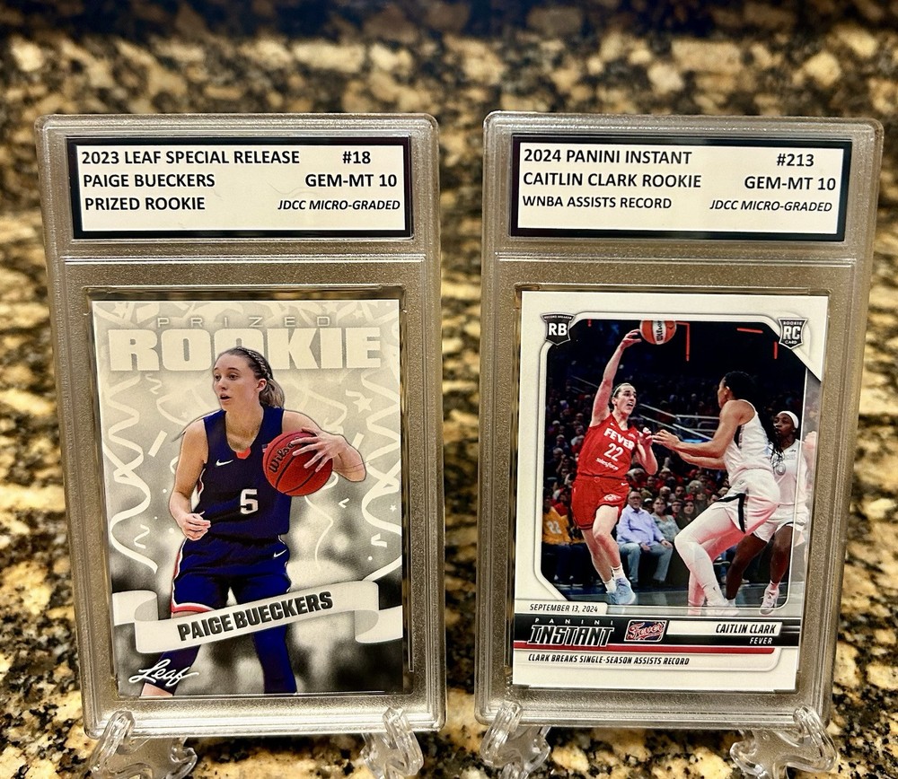 This is a PRESALE ORDER SET FOR 40 DAY DELIVERY. The Caitlin Clark #213 & Paige BUECKERS #213 are JUST AN EXAMPLE OF WHAT the Paige BUECKERS #PBD WILL LOOK Like. YOU WILL RECEIVE A Professionally inspected under a microscope, encased and sealed PAIGE BUECKERS 2024 Panini Instant NIL GRADED GEM-MT 10 ROOKIE #PBD Presale! COA! Cards are Professionally inspected under a microscope, encased and sealed by JDCC - JD’S Coins and Collectibles! This item is encased in a Crystal Clear Slab with tamper proof #'d hologram sticker and certificate of authenticity marked label for extra security and authenticity! The matching SERIAL #’D JDCC COA will accompany this item for future verification. Any tampering or removal of the hologram labels will void the JDCC grading authenticity of the item encased. For further protection the case is fitted with a plastic sleeve. It is best to keep the item in the plastic sleeve to protect the slab from any scratches, etc. This is a beautiful product for display and safekeeping! PLEASE FOLLOW OUR STORE FOR NEW INVENTORY & EXCLUSIVE OFFERS! I combine shipping at .50 cents per additional item capped at $9.99. International rates are $14.99. Feel free to send me offers for multiple items and qualify for discount shipping rates and lower costs per item! I send daily invoices every morning so be sure to wait for your combined shipping invoice before checkout or request an invoice when you are ready to pay. Please keep in mind shipping and handling fees don't just cover postage but also ebay/paypal fees, supplies, taxes and other costs. 5 Star feedback is Greatly appreciated! Good luck and enjoy! I combine shipping at .50 cents per additional item capped at $9.99. International rates are $14.99.Feel free to send me offers for multiple items and qualify for discount shipping rates and lower costs per item! I send daily invoices every morning so be sure to wait for your combined shipping invoice before checkout or request an invoice when you are ready to pay. Please keep in mind shipping and handling fees don't just cover postage but also ebay/paypal fees, supplies, taxes and other costs. 5 Star feedback is Greatly appreciated! Good luck and enjoy!