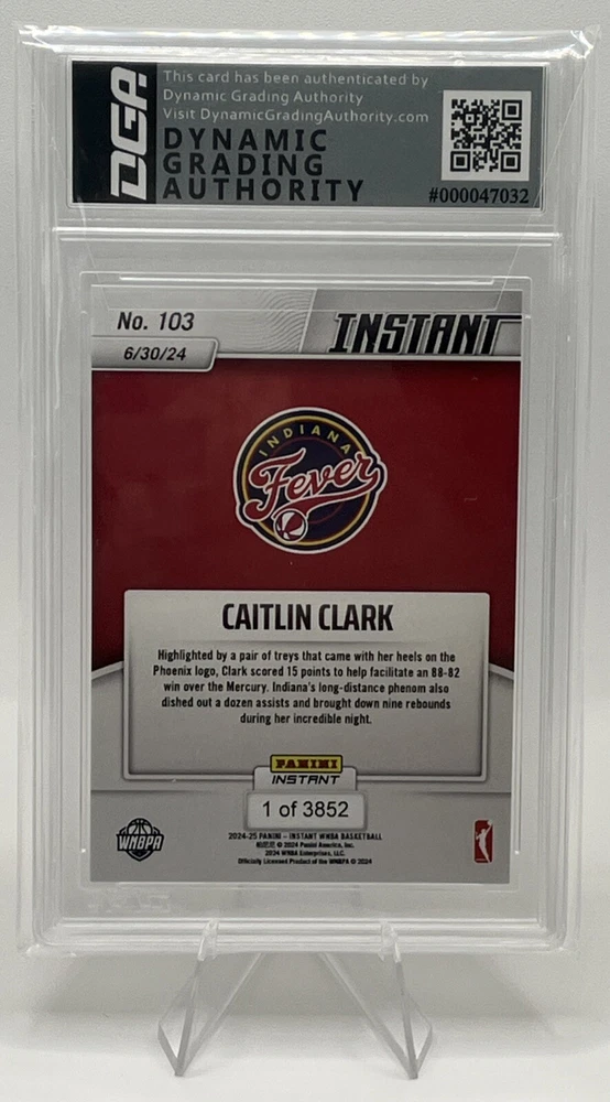 It is a 2024 Panini Instant WNBA trading card featuring rookie player Caitlin Clark, card number 103. This sports trading card is part of the 2024 Panini set and is manufactured by Panini. It is specifically from the Women's National Basketball Association (WNBA) league.