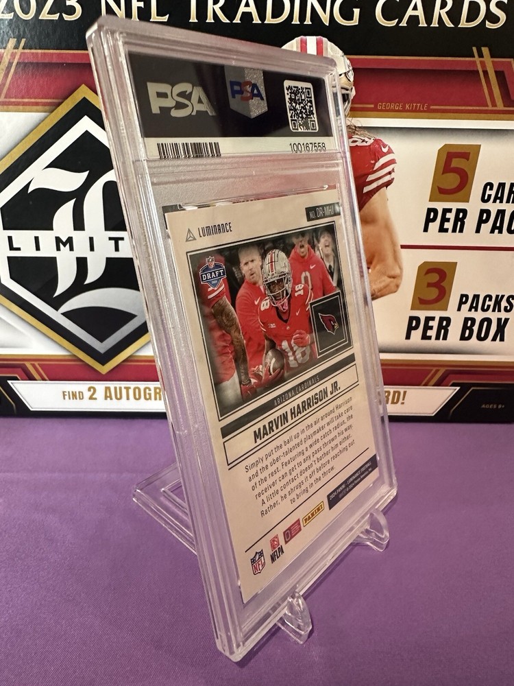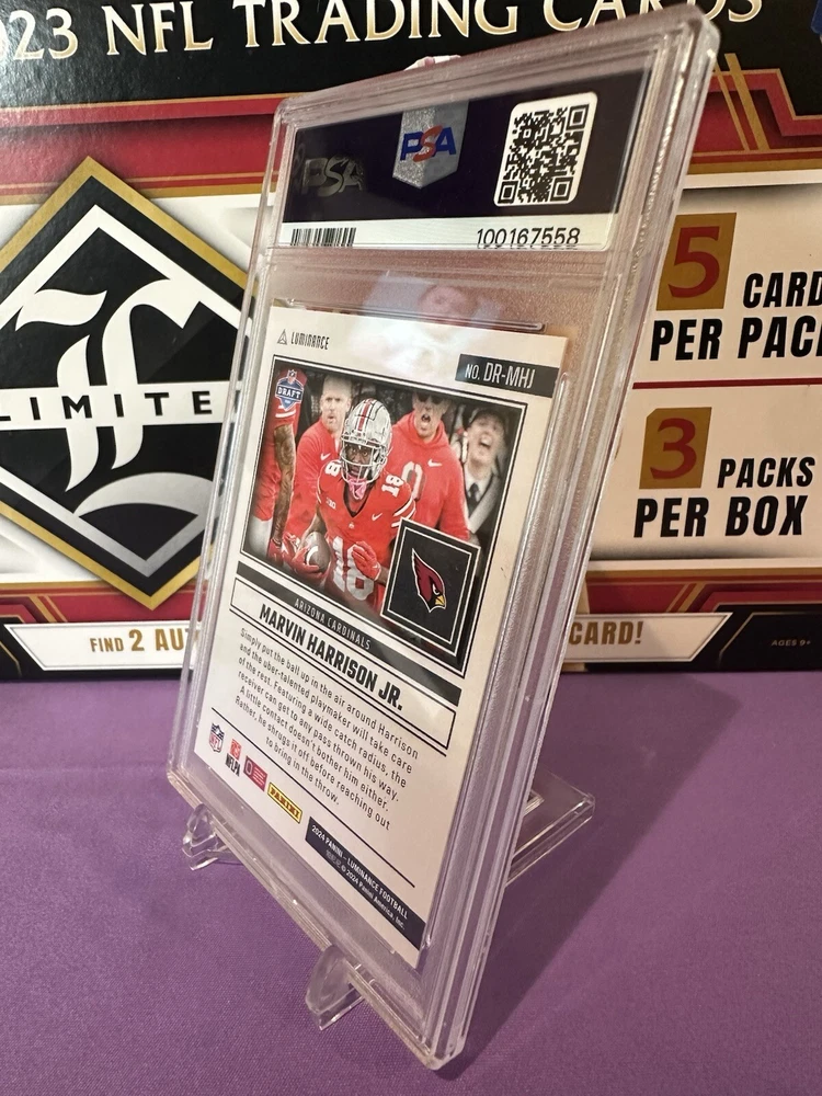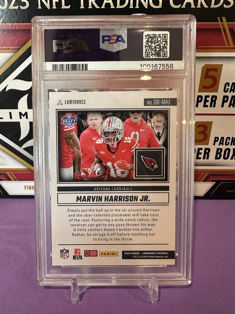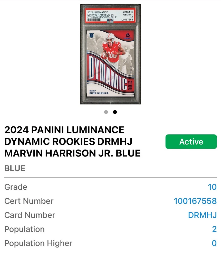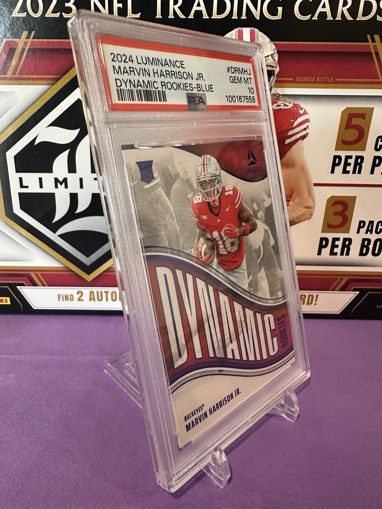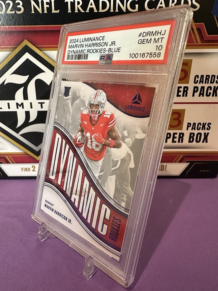 Capture a piece of football history with the 2024 Panini Luminance Dynamic Rookies Blue card featuring rising star Marvin Harrison Jr. of the Arizona Cardinals. This card, numbered DR-MHJ, showcases Harrison in his rookie season, adding an essential piece to any collector's portfolio. With its limited print run of just 50, this card is as exclusive as it is prestigious. Crafted by Panini, a trusted name in sports memorabilia, this card is part of the coveted 2024 Luminance set and comes in standard size with a 20 Pt. thickness. It's presented in English and originates from the United States, ensuring its authenticity. Though not autographed, its rookie status and serial numbering make it a valuable find for NFL enthusiasts and collectors alike. Population of Only 2!!!