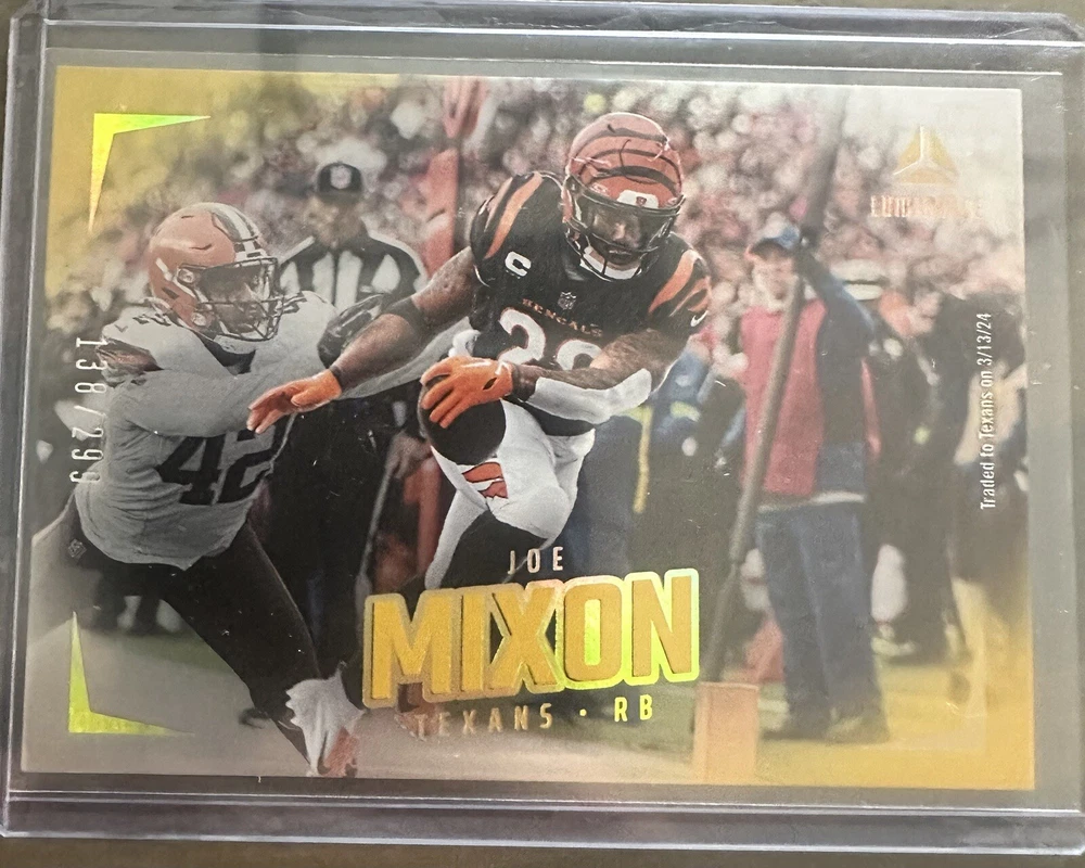 This 2024 Panini Luminance trading card features Joe Mixon of the Houston Texans in a Gold parallel/variety. The card is serial numbered 138/299 and is part of the base set. It is a sports trading card for football fans and collectors, manufactured by Panini in the year 2024. The card is in excellent shape and is near mint or better, ungraded. It is a great addition to any collection and perfect for fans of Joe Mixon and the Houston Texans. Get this card now before it's too late!