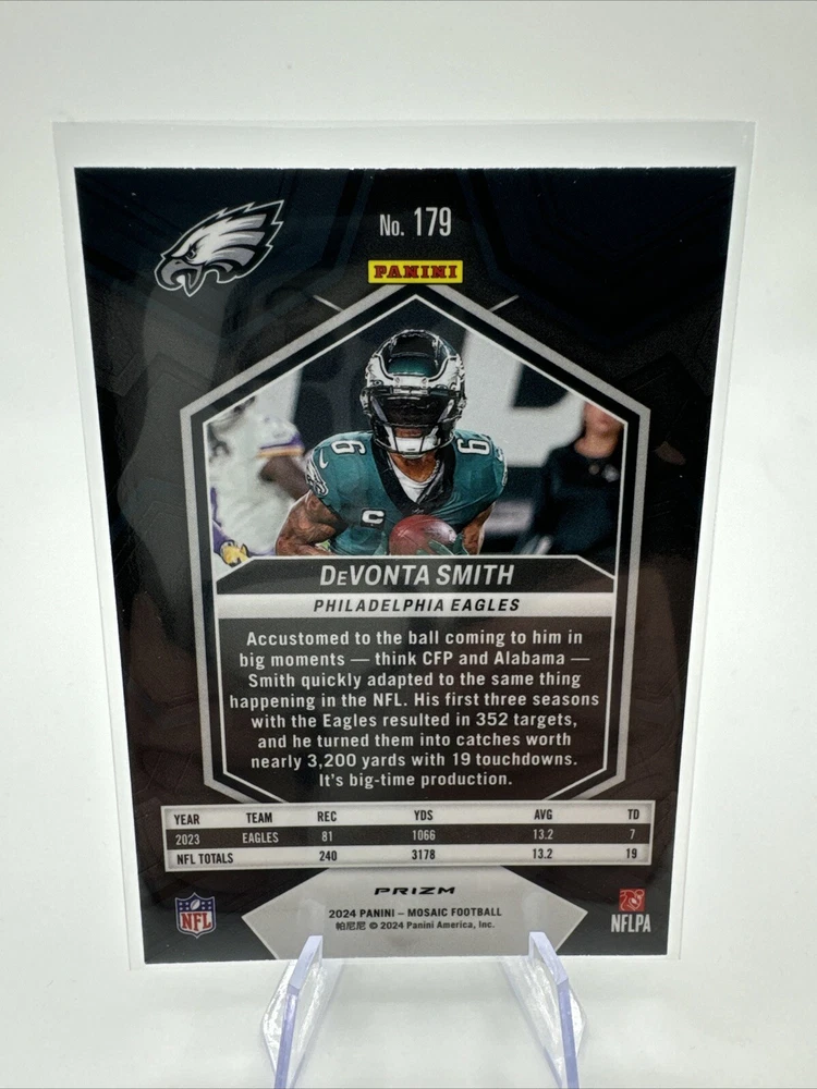 Elevate your sports card collection with the 2024 Panini Mosaic Devonta Smith #179 Silver Mosaic Prizm card. This striking piece features the Philadelphia Eagles' star receiver, DeVonta Smith, and is a must-have for fans and collectors alike. A highlight of the 2024 Panini set, this card boasts the eye-catching Mosaic Prizm parallel that sets it apart from the base set. The card comes from a series well-regarded for its quality and design, including features such as a hologram, box topper, and chase elements that cater to collectors seeking unique and limited-edition items. While not autographed, its status as a short print makes it a valuable find for those looking to complete their NFL collections or simply own a piece of football memorabilia that celebrates the skill and potential of DeVonta Smith.