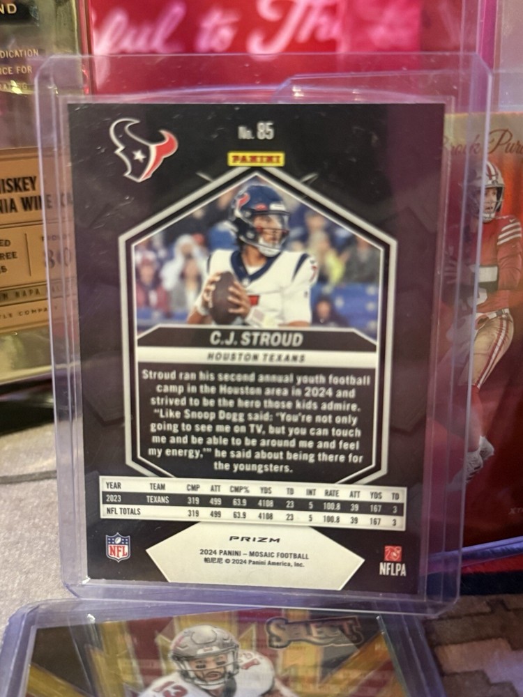 Type:Sports Trading CardPlayer/Athlete:C. J. StroudFeatures:Base Set, Parallel/VarietySeason:2024Sport:FootballManufacturer:PaniniTeam:Houston TexansSet:2024 Panini MosaicParallel/Variety:Honeycomb PrizmCard Number:85League:National Football League (NFL)