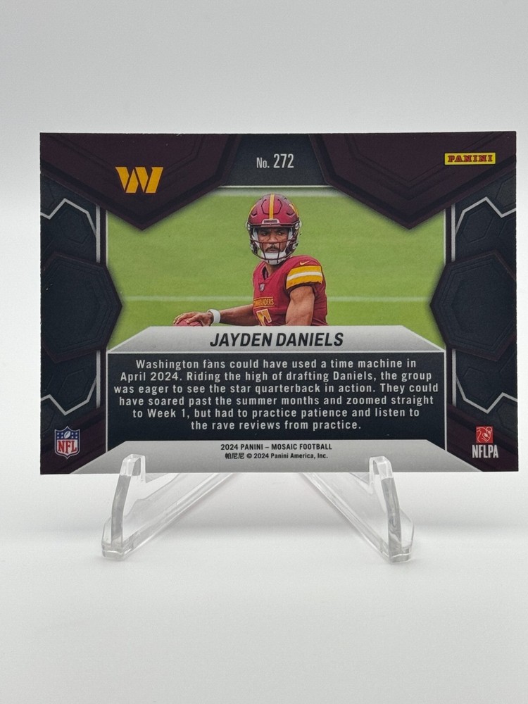 This listing is for the following card: 2024 Panini Mosaic - Jayden Daniels (RC) #272 NFL Debut WASHINGTON COMMANERS NFL OFFENSIVE ROOKIE PLAYER OF THE YEAR Mailing Process: Every card is placed in a penny sleeve and top loader. We then protect the card with a team bag and place two Ding Defense sheets on each side. Finally, all card(s) are placed in a fitted bubble mailer and is securely sealed to ensure that it arrives in shape you expect it to be in! Our handling time is technically 1 day. That said 99.9% of the time if an order is in prior to 3pm est, it will go out same day. Saturday is the only exception, orders generally need to be in before 12pm est to guarantee that it goes out the same day. Orders that come in after 12pm and before 4pm est, still have a 95% chance that it goes out same day but is subject to being held for the following Monday for shipment. Please feel free to ask any questions, thanks for your interest!