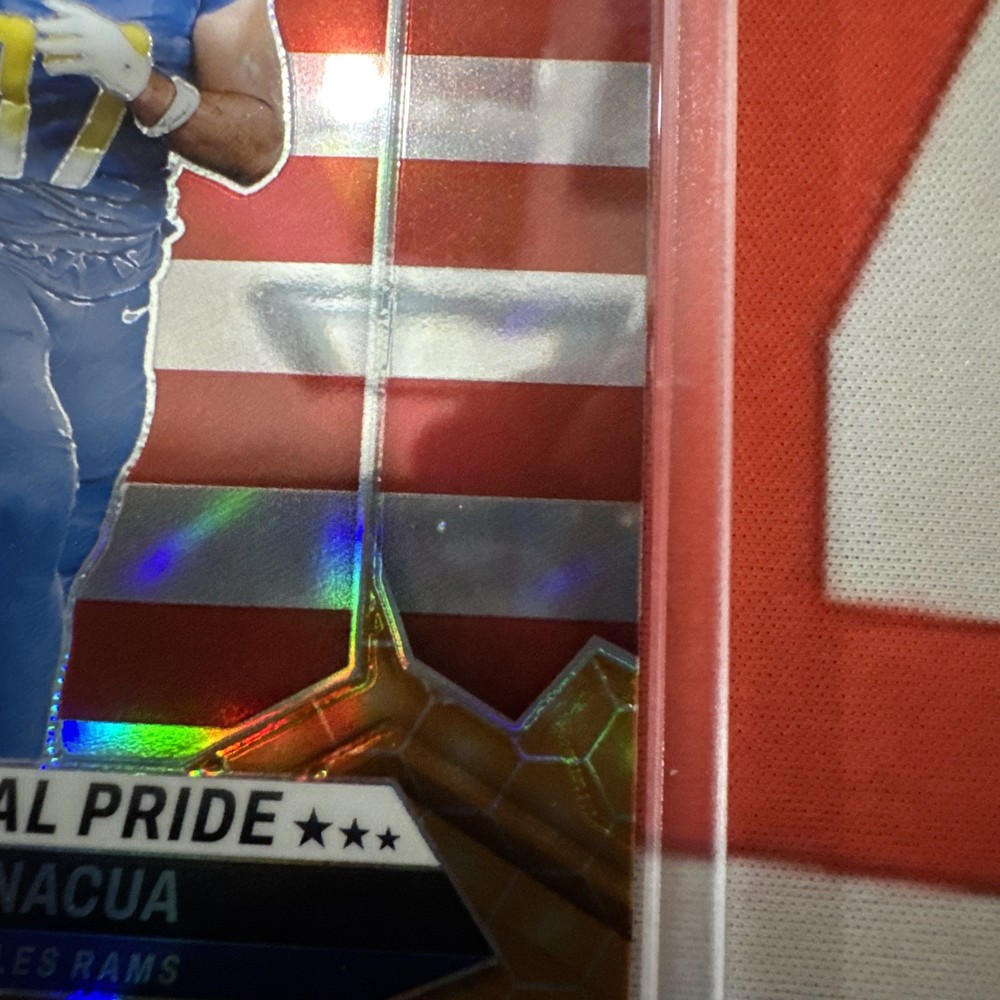 The 2024 Panini Mosaic National Pride Puka Nacua #264 Honeycomb Prizm football trading card is a highly sought-after collectible item for fans of the Los Angeles Rams and the National Football League. With its unique Honeycomb Prizm parallel variety and base set design, this card features the talented player Puka Nacua in a standout display. As part of the excellent condition set, this card is a must-have for any football card collector looking to add a rare and special piece to their collection. Beautiful card, has 1 lil print ding on the silver on flag shown in pic
