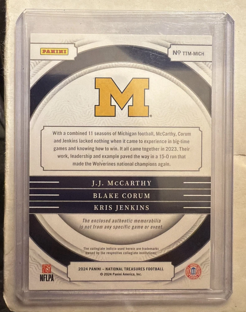 2024 Panini National Treasures Blue JJ McCarthy Corum Jenkins /75 Rc Michigan. Condition is Ungraded. Shipped with USPS Ground Advantage.