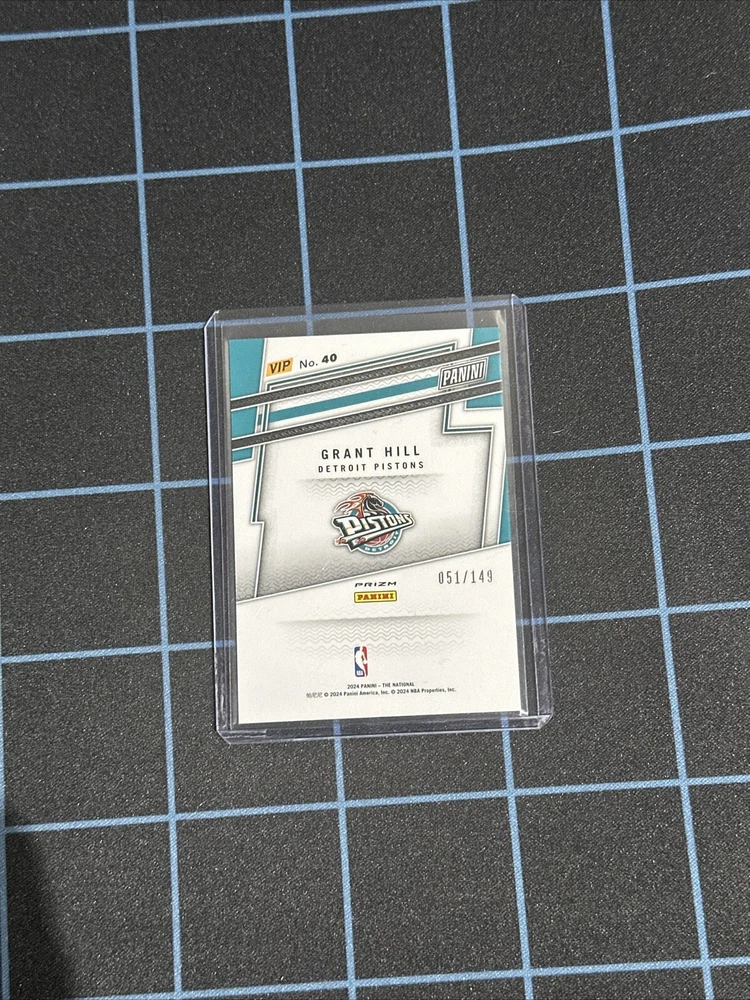 This 2024 Panini National Convention VIP Gold Packs trading card features Grant Hill, a basketball player from the Detroit Pistons team. The card is an original and licensed reprint with a serial number of 149. It is a short print with a Red Ice Prizm parallel/variety. The card is part of the National Basketball Association (NBA) league and is manufactured by Panini. It is a sports trading card with features that make it unique, including its design and rarity. This card is perfect for collectors who want to add a valuable item to their collection.