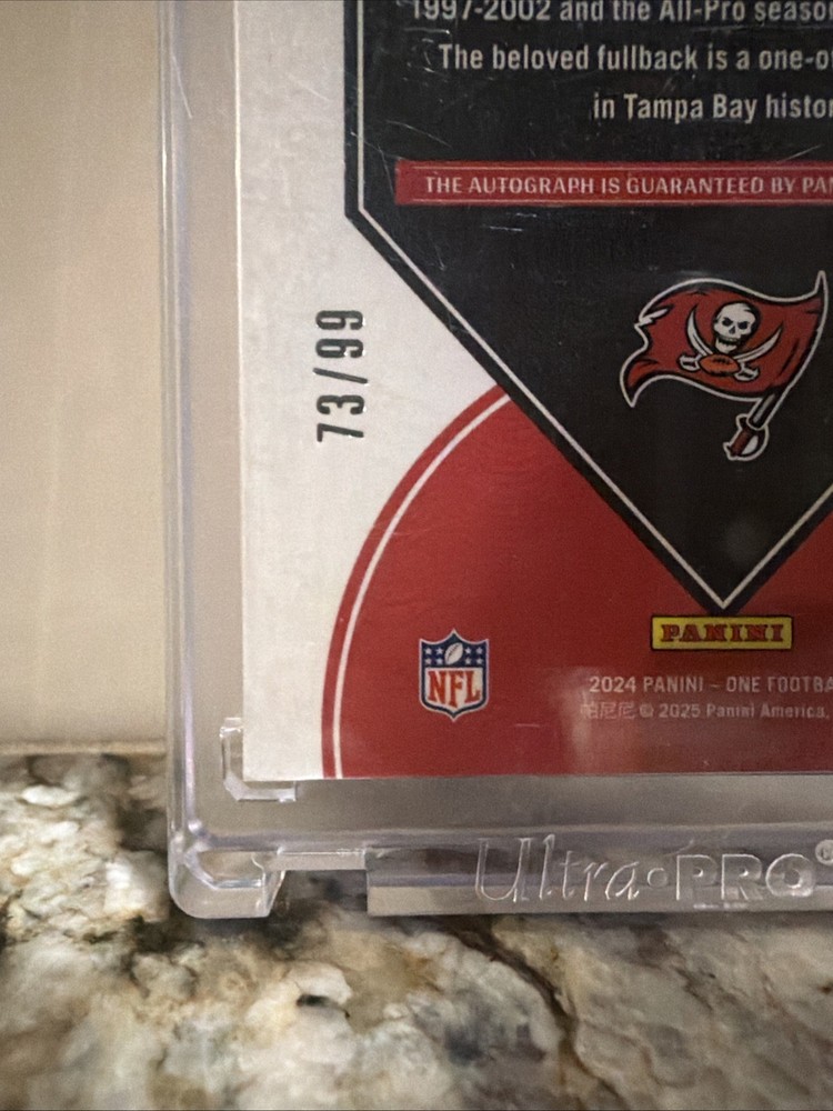 The 2024 Panini One - Once in a Franchise Autographs Mike Alstott #343 /99 is a highly collectible sports trading card from the National Football League (NFL). This limited edition card features the autograph of former Tampa Bay Buccaneers player Mike Alstott and is serial numbered to 99, making it a rare find for football card collectors. With its exclusive print run and premium features, this card is a valuable addition to any sports memorabilia collection, showcasing a piece of NFL history with a modern twist. Bucs Legend, uncirculated, sealed by panini