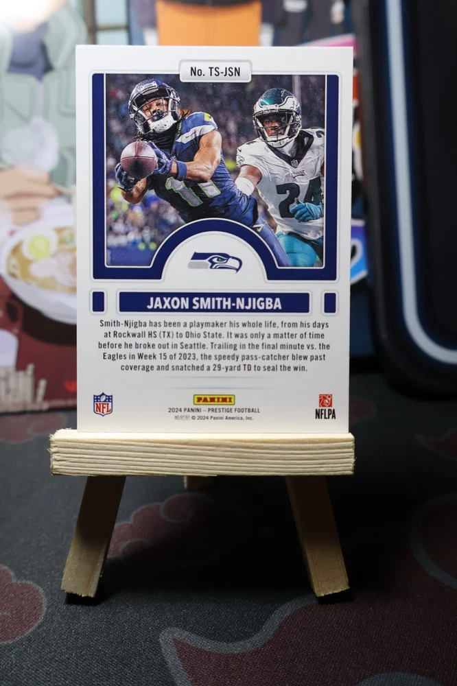 Player/Athlete: Jaxon Smith-Njigba Team: Seattle Seahawks Card Number: TS-JSN Set: 2024 Panini Prestige Season: 2024 Parallel/Variety: Time Stamped Manufacturer: Panini Features: Stamped Insert Set: Time Stamped Autographed: No Type: Sports Trading Card Sport: Football League: NFL