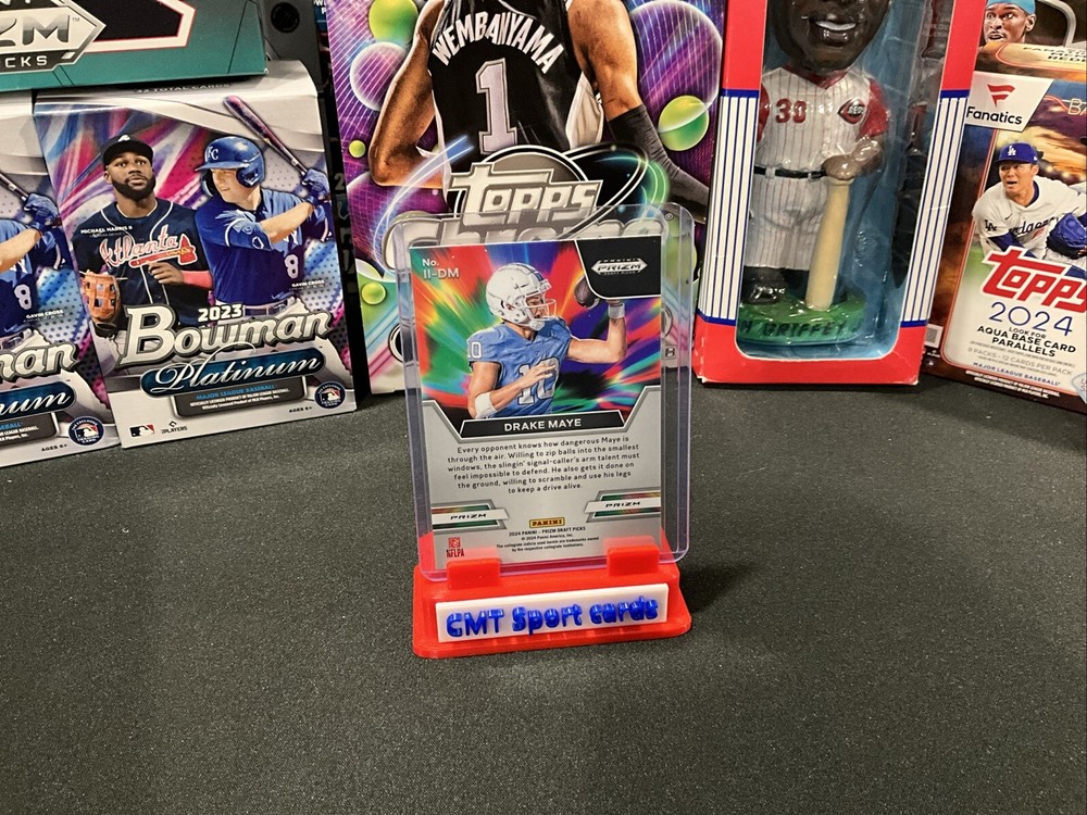The 2024 Panini Prizm Draft Picks card features rookie football player Drake Maye in his North Carolina Tar Heels college uniform, with an Instant Impact design for the New England Patriots. This standard-sized sports trading card is part of the Prizm parallel variety and is officially licensed by the National Collegiate Athletic Association (NCAA) and National Football League (NFL). The card number is II-DM and it is manufactured by Panini for the 2024 season, making it a valuable collectible for fans and card enthusiasts.