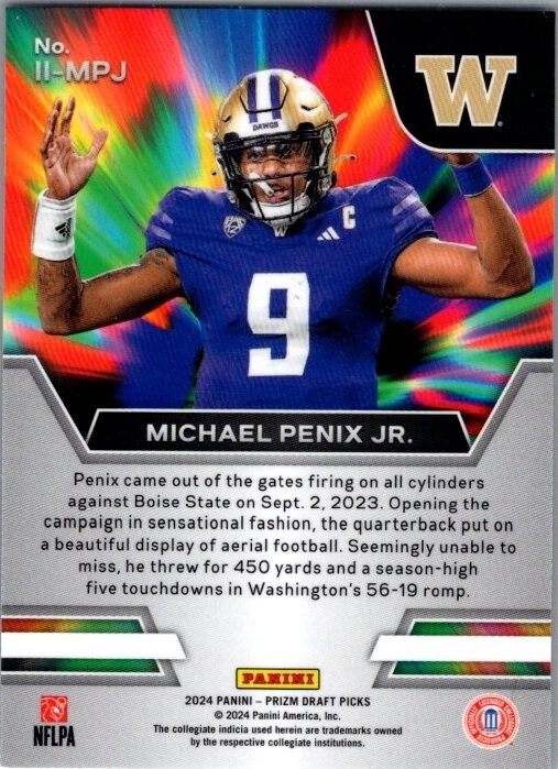 Discover the 2024 Panini Prizm Draft Picks - Instant Impact #II-MPJ Michael Penix Jr. Rookie Card, a must-have for football enthusiasts and collectors alike. Featuring the promising talent from the Washington Huskies and Atlanta Falcons, this card captures the essence of Michael Penix Jr.'s early career. With its Prizm parallel variety, the card stands out in its visual appeal, complemented by its inclusion in the esteemed Base Set and Insert from the Instant Impact series. While not autographed, this sports trading card is an exceptional piece commemorating the 2024 football season and a noteworthy addition to any collection.