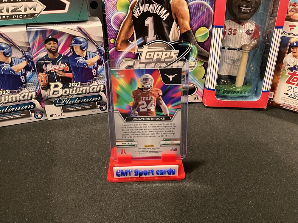 This is a Jonathan Brooks 2024 Panini Prizm Draft Picks Instant Impact Rookie Card featuring the player in his Texas Longhorns uniform. The card is part of the Instant Impact insert set and has a Prizm parallel. It is an original card manufactured by Panini for the National Collegiate Athletic Association (NCAA) football league. The card number is II-JB and it is in English.