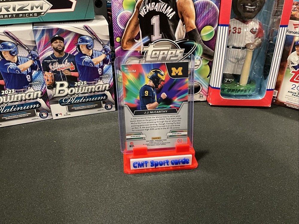 The product is a 2024 Panini Prizm Draft Picks trading card featuring J.J. McCarthy, a rookie player from Michigan Wolverines. This card is an Instant Impact Rookie RC with a Prizm parallel, indicating it is a special insert version. It is not autographed or graded, but it is part of a set from Panini for football fans and collectors to enjoy. The card includes the player's association with both the Michigan Wolverines and Minnesota Vikings, making it a desirable collectible for fans of those teams.