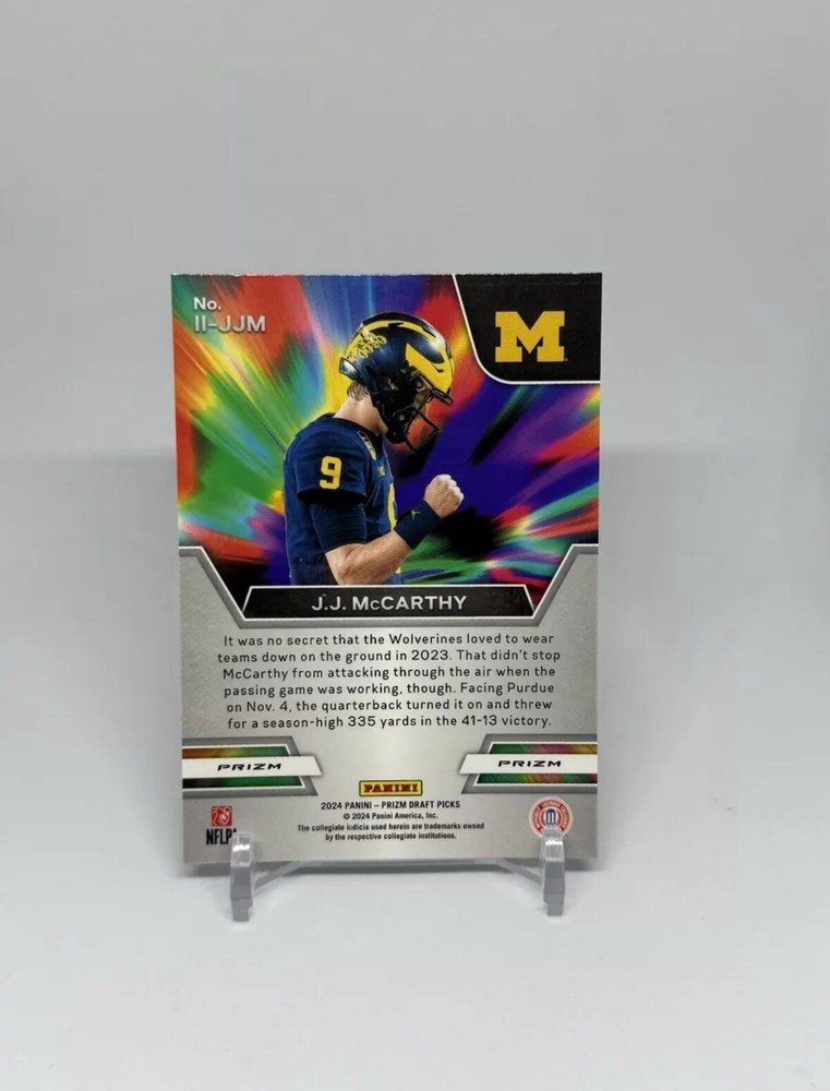 This 2024 Panini Prizm Draft Picks trading card features J.J. McCarthy, a rookie player from the Michigan Wolverines and Minnesota Vikings teams. The card is a Green parallel/variety, with a card number of II-JJM. It is an original, ungraded card that is near mint or better in quality. The card is a must-have for fans and collectors of National Football League (NFL) memorabilia. It is a sports trading card that is licensed by Panini, a reputable manufacturer of trading cards. This card is a great addition to any collection and is sure to impress with its unique features and impressive quality.
