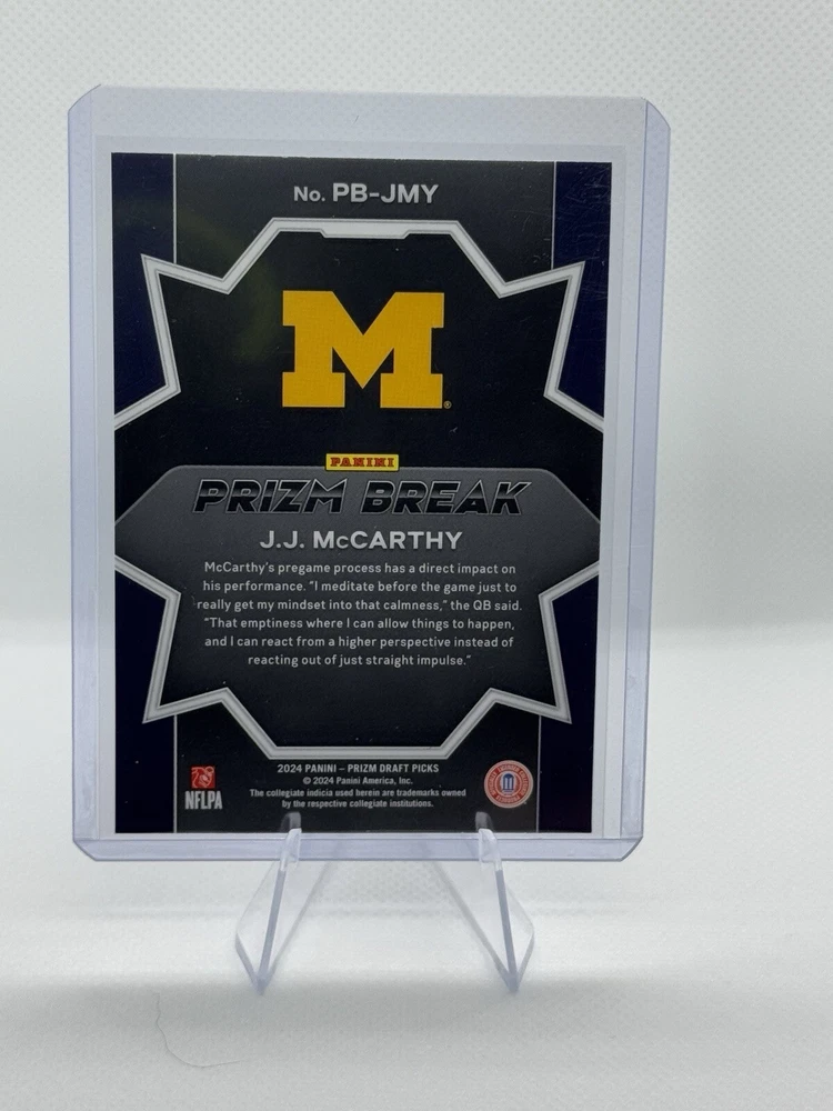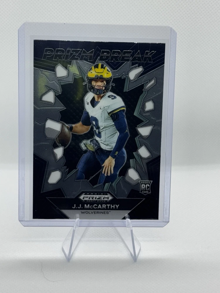 Elevate your collection with the 2024 Panini Prizm Draft Picks Prizm Break card featuring the up-and-coming talent, J.J. McCarthy. As a standout player, McCarthy's card is a coveted piece for enthusiasts and collectors alike. This card, numbered PB-JMY, captures the essence of his dynamic presence, whether it's on the field for the Michigan Wolverines or in your personal assortment of sports memorabilia. From the vibrant world of sports trading cards, this item shines with its Prizm Break parallel variety, adding a unique flair to its design. The card is a product of Panini, a trusted name in the industry, and it belongs to the 2024 set, ensuring its place among the latest releases. It's a must-have for followers of NFL, NCAA, or anyone with an eye for the future of football.