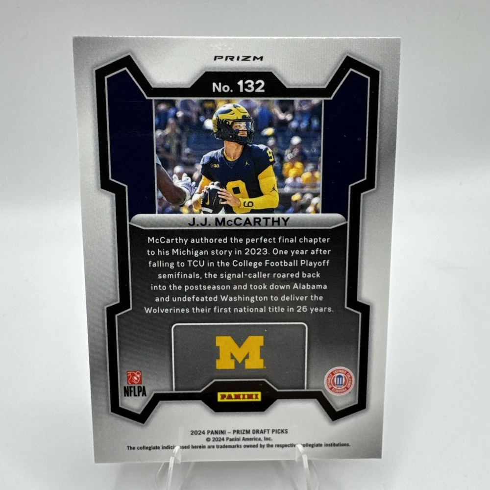 Capture the excitement of the gridiron with this 2024 Panini Prizm Draft Picks Red Cracked Ice card featuring the talented J.J. McCarthy. An eye-catching addition to any collection, card #132 showcases McCarthy in his Michigan Wolverines gear, a must-have for fans and collectors alike. This card is a striking example of the Red Cracked Ice parallel, adding a unique and desirable touch to your sports memorabilia. Crafted by Panini, a trusted name in sports trading cards, this piece hails from a series known for its quality and collectibility. The card is a tribute to both the NCAA and NFL, celebrating the future of football with a nod to the player's rookie season. Whether you're a die-hard Vikings supporter or a follower of emerging football talent, this card is a fine keepsake to commemorate the 2024 sporting calendar.