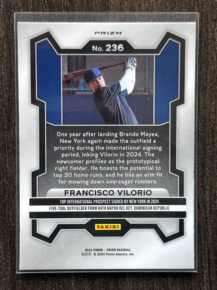 Dive into the 2024 baseball season with the Panini Prizm Francisco Vilorio Green Prizm card, featuring the promising talent of the New York Yankees. Card number 236 from the set captures Vilorio in his rookie year, displaying the potential that lies ahead for fans and collectors alike. The vibrant Green Prizm parallel adds an eye-catching flare to this collectible, making it a standout piece. Crafted with quality in the United States, this sports trading card aligns with the standard card size, ensuring it fits seamlessly into any collection. Whether you're a dedicated follower of the Yankees, a Vilorio fan, or a connoisseur of MLB memorabilia, this card is a noteworthy addition to any assortment.