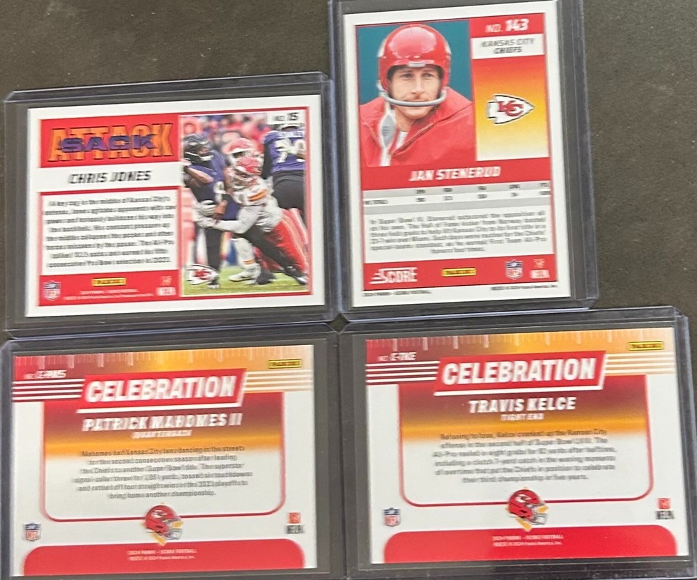 2024 Panini Score Football 4 card insert/parallel trading lot for the Kansas City Chiefs! The cards are: 2024 Score Jan Stenerud #143 Green Border Parallel 2024 Score Patrick Mahomes II #C-PMS Celebration Insert 2024 Score Travis Kelce #C-TKE Celebration Insert 2024 Score Chris Jones #15 Sack Attack Insert