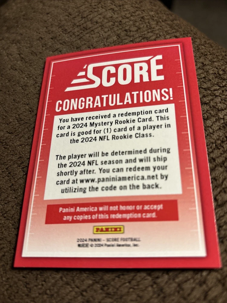 2024 is the first year that Panini introduced the NFL Mystery Rookie Redemption and Score is its first set to be featured. Potential Rookies are determined by Panini through the season. This is a guaranteed card for a breakout rookie that does not currently exist in the Panini Score set, could it be the missing Caleb Williams??