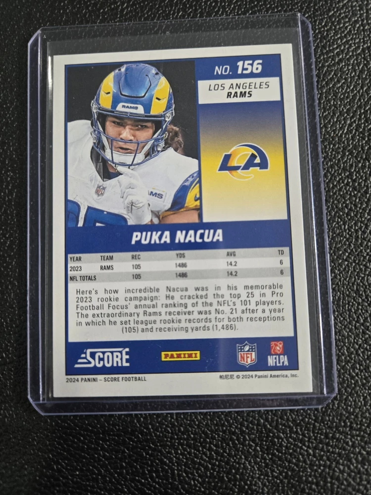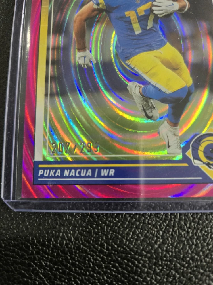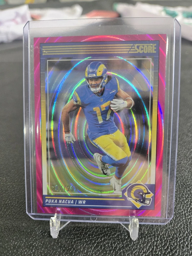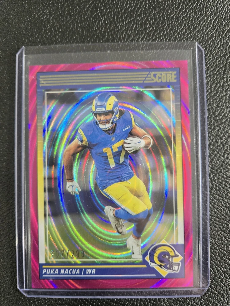 This rare 2024 Panini Score Puka Nacua Pink Eclipse sports trading card is a must-have for any fan of the National Football League (NFL) and the St. Louis Rams. The card features a stunning autograph by Puka Nacua and is authenticated by Score, ensuring its authenticity. With a card number of 299, this ungraded card is part of the 2024 Panini set and is a near mint or better condition. The card is perfect for collectors who are looking for a unique addition to their collection and is a great way to show off your love for football. Don't miss out on the opportunity to own this rare card!
