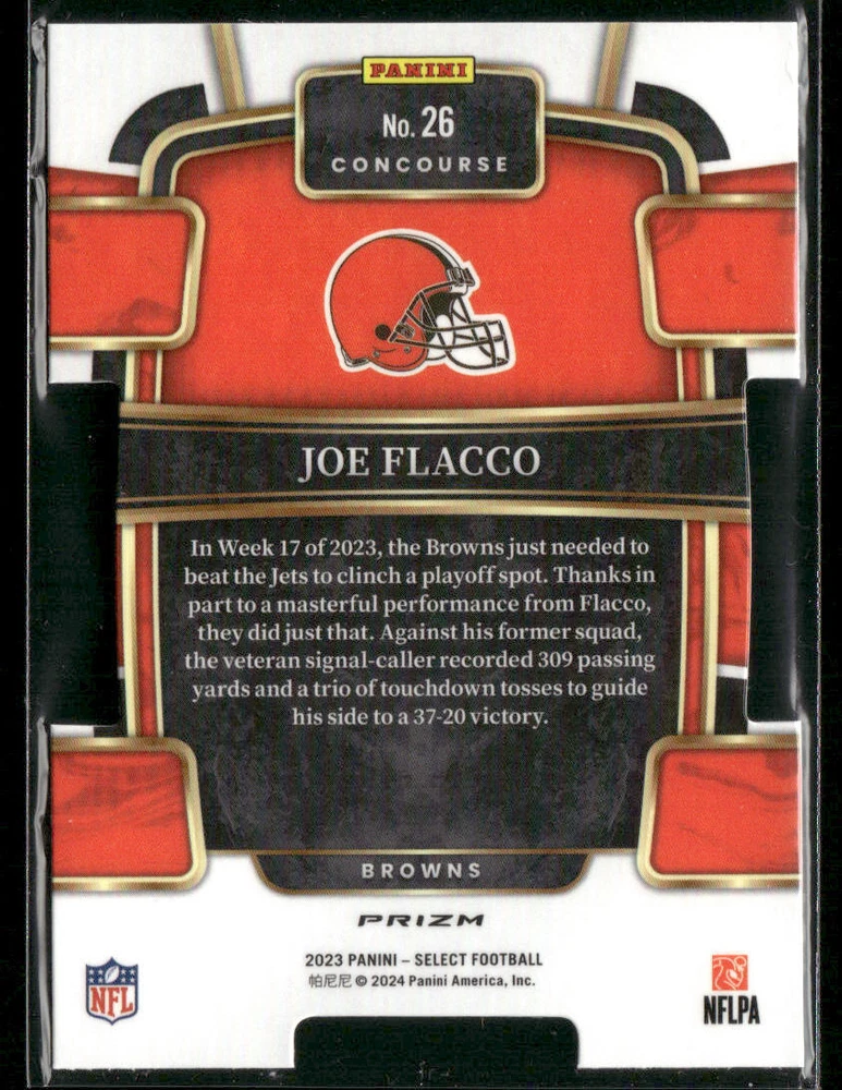 You are purchasing a 2024 Panini Select Joe Flacco #26 Red/Black Die-Cut. You will receive the exact item in the photographs. Thank you for looking. Listed With Mascot .