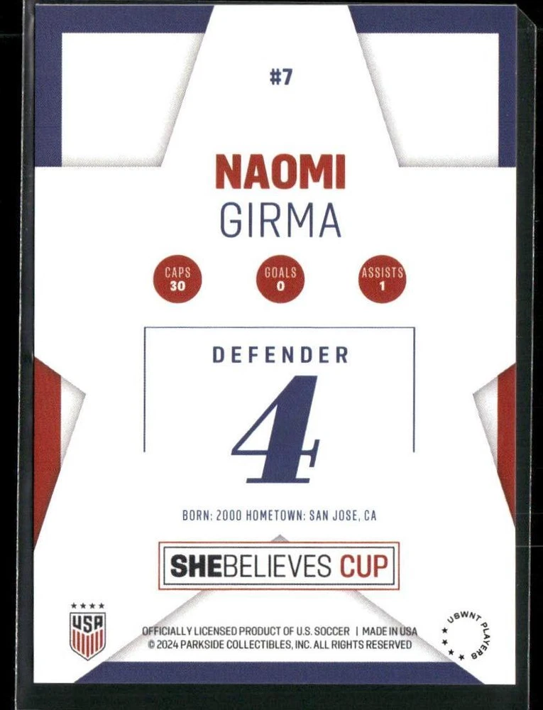 This is a nice example of a 2024 Parkside USWNT SheBelieves Cup #7 Naomi Girma Other important information about this card: In 2024 Naomi Girma played for the USA. Please check out our other listings for more great cards.