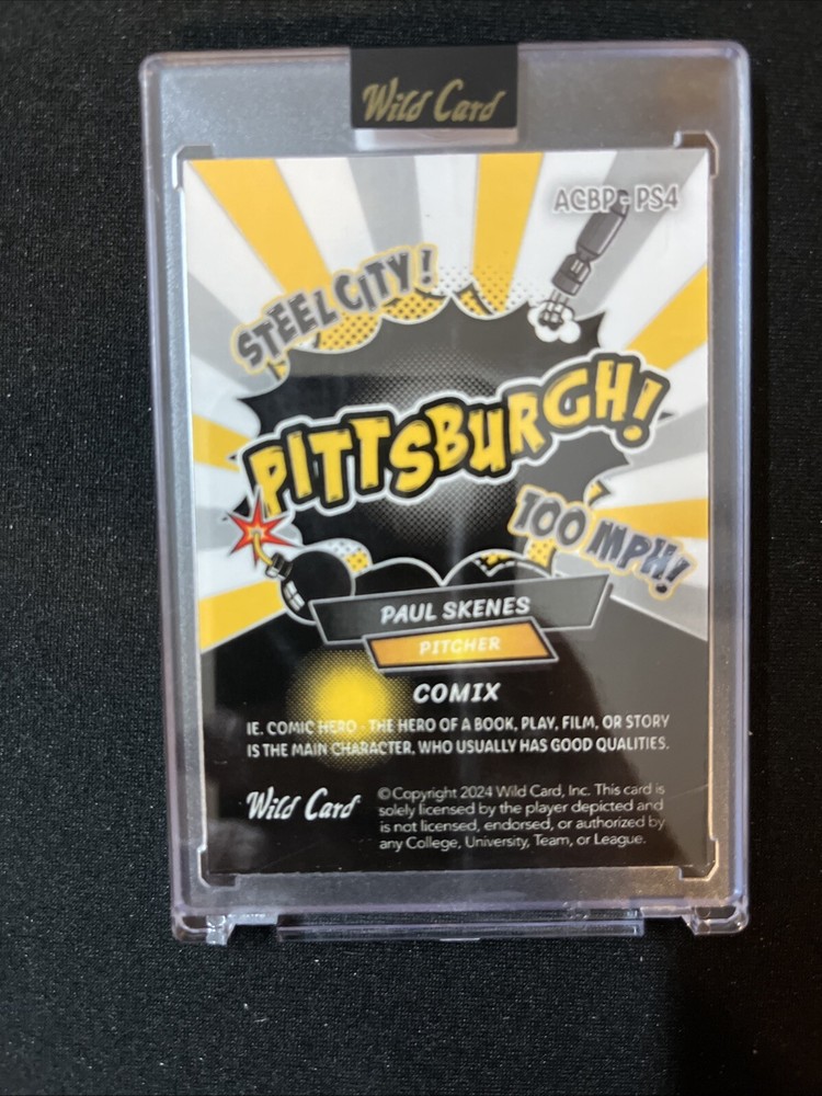 The product is a 2024 Wild Card Alumination Comix trading card featuring Paul Skenes of the Pittsburgh Pirates from Major League Baseball. This card is a rare find, with a print run of only 30 copies and part of the Comix Chrystal Holographic Foil Board parallel/variety. It is an original licensed reprint by Wild Card, featuring serial numbering, a short print designation, and a Rookie card status, making it a highly sought-after collectible for baseball card enthusiasts.