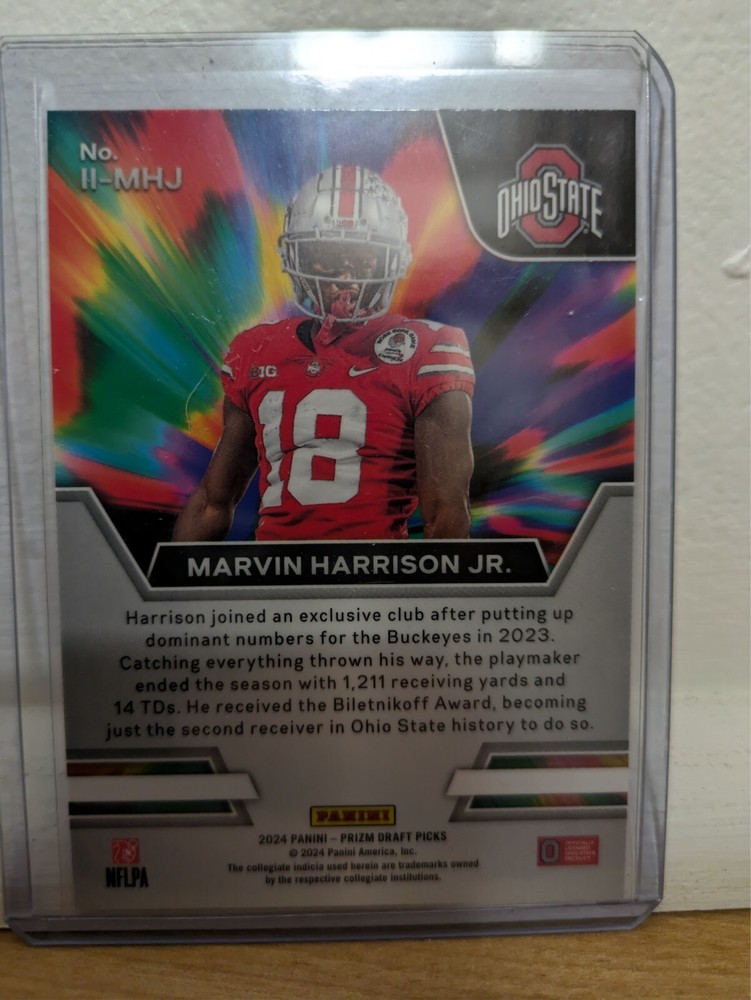 This 2024 Panini Donruss Sports Trading Card features Marvin Harrison Jr. of the Arizona Cardinals. The card is an Instant Impact Rookie RC #II-MHJ, perfect for any football fan or sports trading card collector. The card is part of the Prizm parallel/variety and boasts a card number of 393. The card is manufactured by Panini and includes features such as the rookie status of the player. It is a must-have for any fan of the National Football League (NFL) and sports trading cards. Get your hands on this valuable item today!