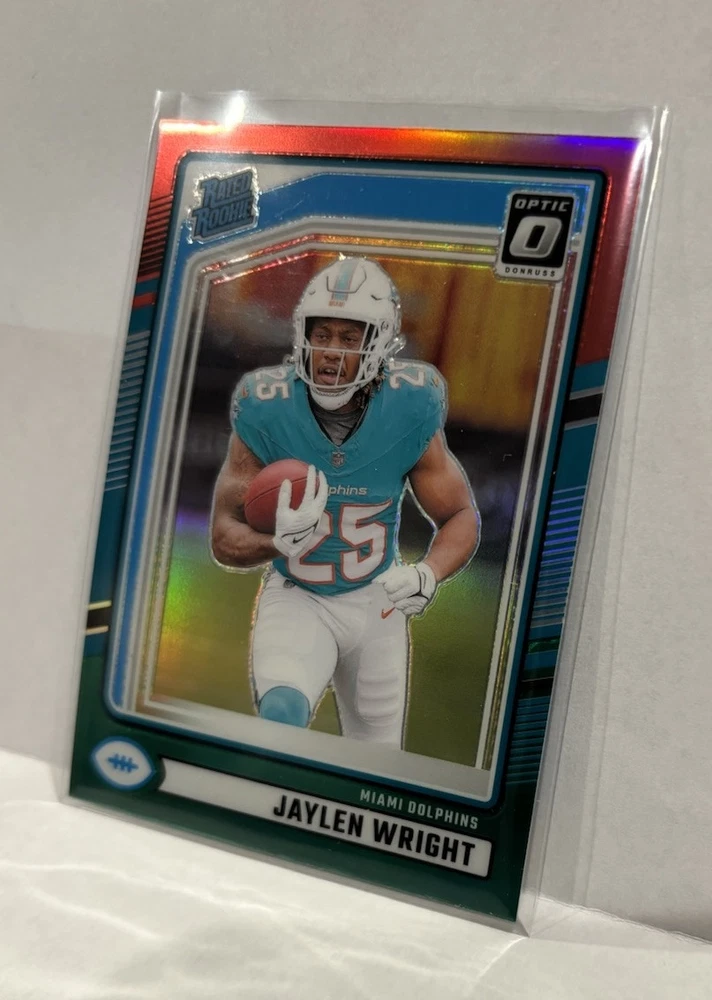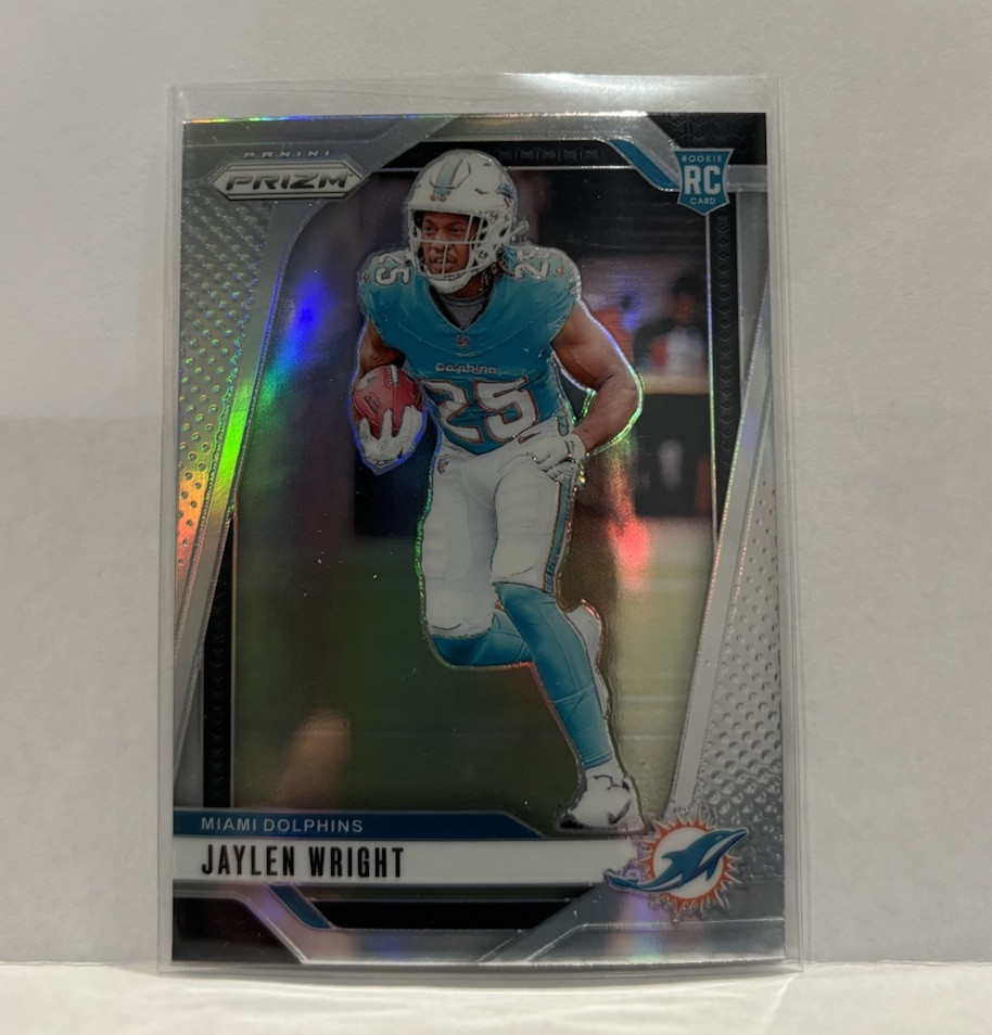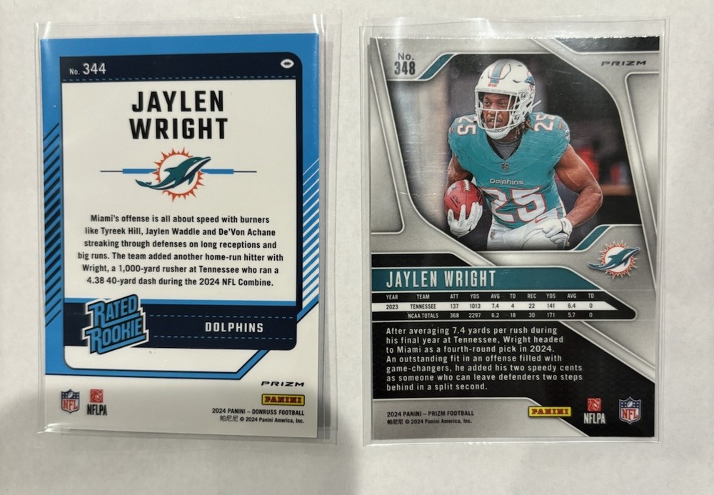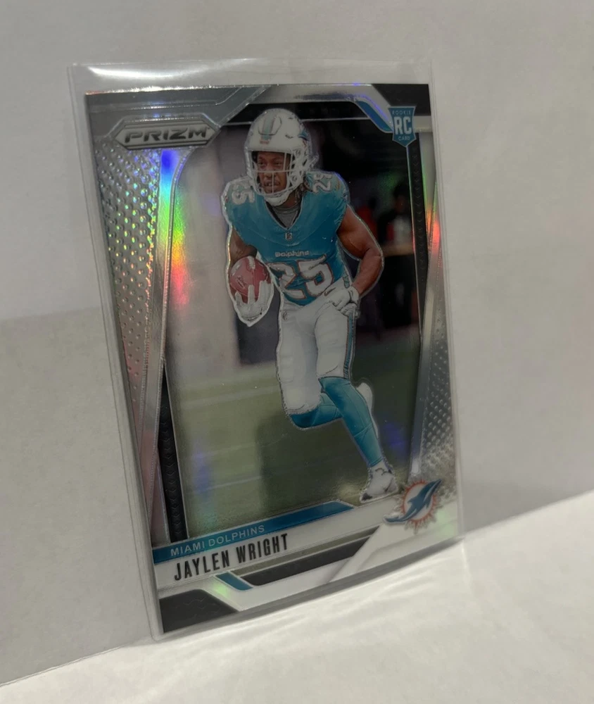 Enhance your sports card collection with this 2024 Prizm Parallel LOT featuring Jaylen Wright. The lot includes Optic Red Green and Silver #344 #348 cards, making it a perfect addition to any Miami Dolphins fan's collection. The cards are made of high-quality card stock and are original, licensed prints from Panini. The cards are in standard size and feature Jaylen Wright, a promising talent in the National Football League (NFL). The cards are perfect for trading or displaying, and they will make a great addition to any sports memorabilia collection. Don't miss out on this opportunity to own a piece of sports history!