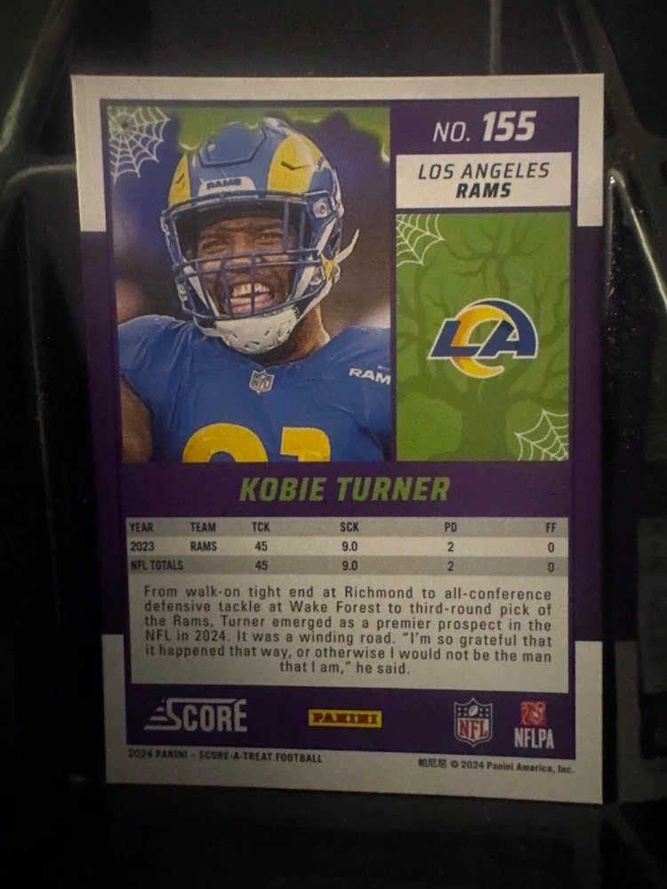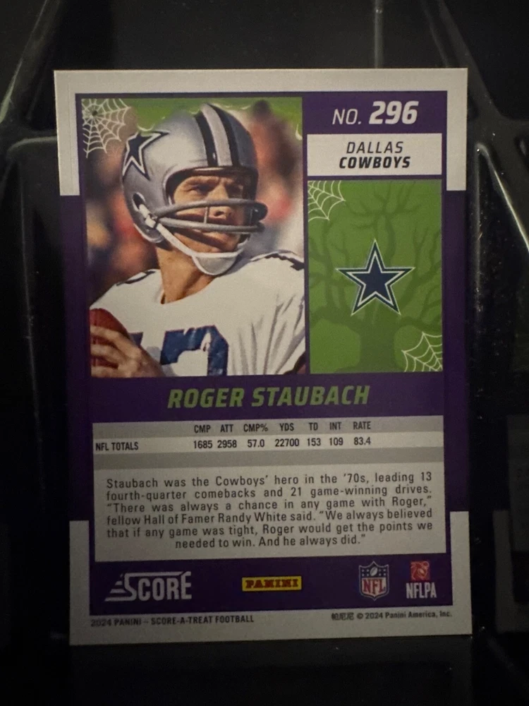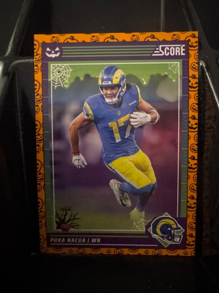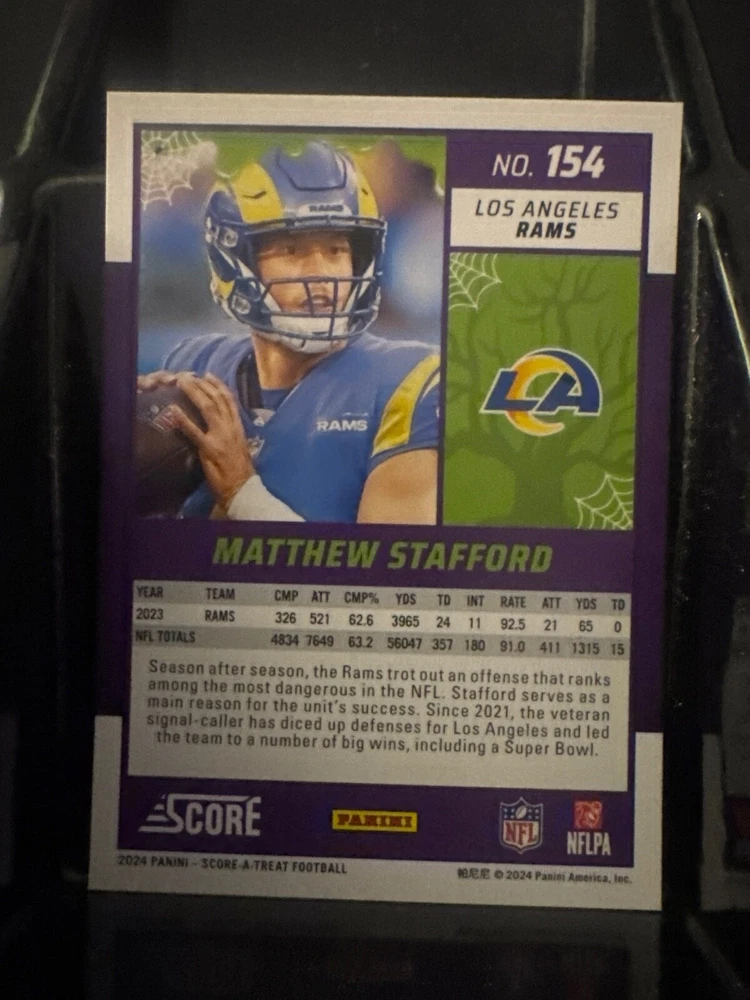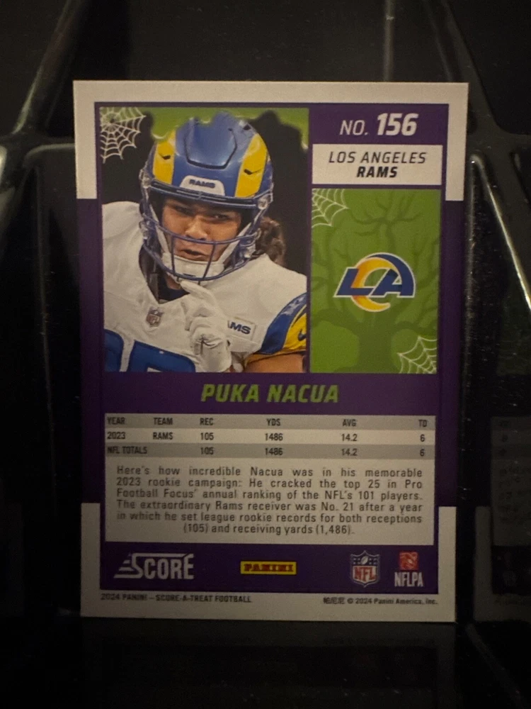Complete your set of 2024 Score A Treat Football trading cards with the Green Bats parallel/variety. This card features some of the most exciting players in the National Football League (NFL), including Aaron Donald, Taysom Hill, and Randy Moss. The card is an original, licensed reprint from Panini and is part of the base set. The card number is 151-300 and it is a standard size for sports trading cards. The language is in English and the cards were manufactured in the United States. This card is a great addition to any football fan's collection, especially those who are fans of the San Francisco 49ers, Houston Texans, or Philadelphia Eagles.
