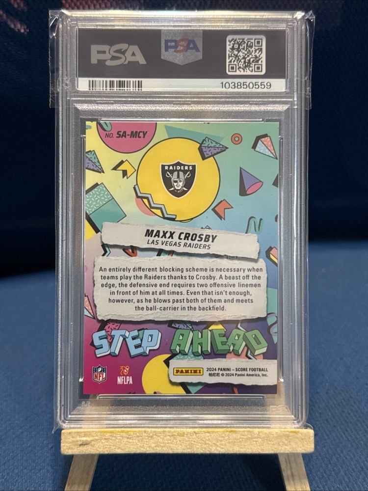 The product is a 2024 Score Max Crosby Step Ahead Linticular trading card featuring the Las Vegas Raiders player. This original sports trading card is part of the STEP AHEAD LINTICULAR insert set by Panini in the National Football League (NFL) theme. The card is made of card stock and includes hologram, short print, and exclusive features. It is a collectors edition with a lenticular design, making it a rare find as a PSA9 graded case hit with a population of 2.
