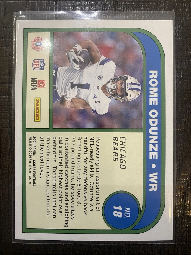Team:Chicago Bears, Washington HuskiesPlayer/Athlete:Rome OdunzeAutographed:NoSet:2024 ScoreManufacturer:PaniniLeague:National Football League (NFL)Features:Insert, Rookie, Parallel/VarietyParallel/Variety:PinkSport:FootballType:Sports Trading CardSeason:2024