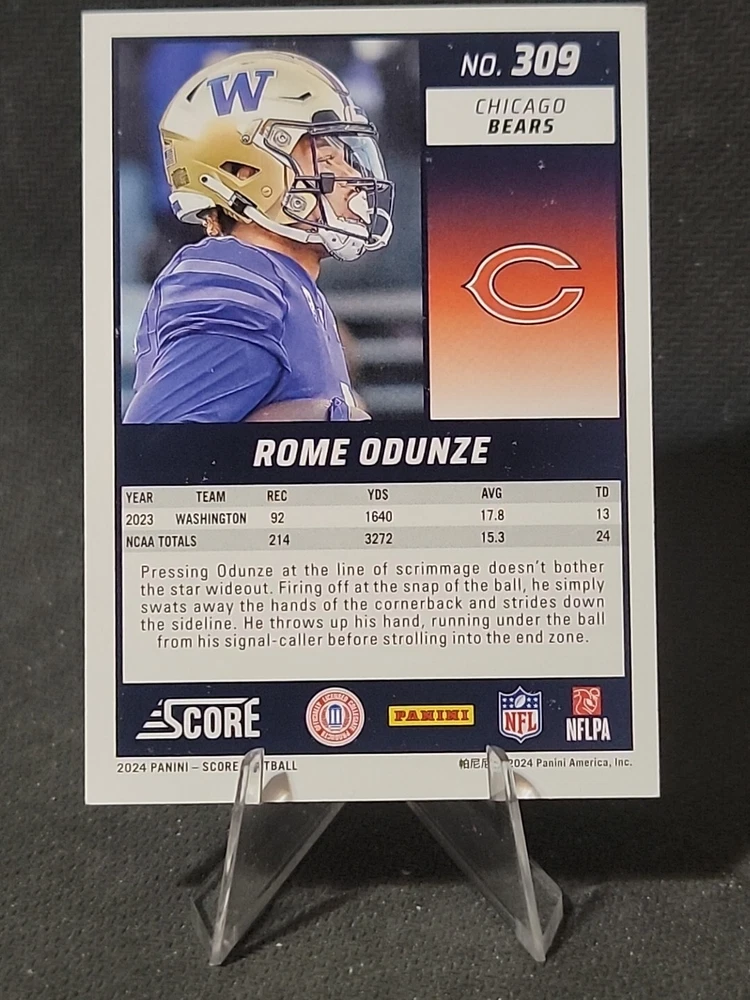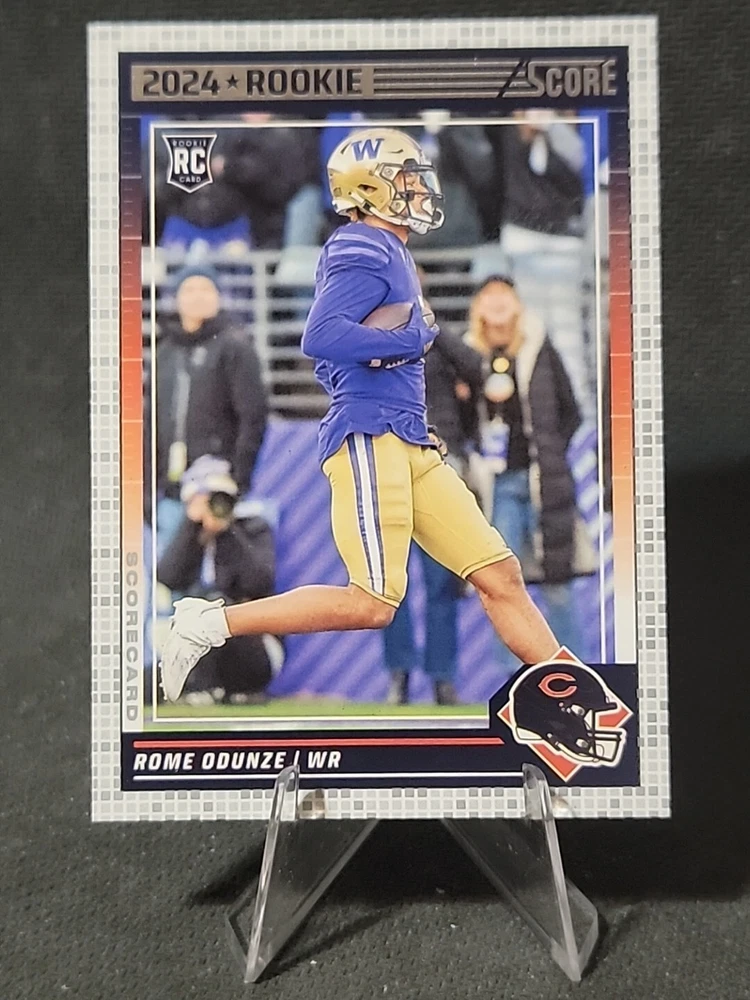 This 2024 Score card features Rome Odunze, a player from the Chicago Bears and Washington Huskies teams. The card is part of the Rookies Scorecard set, with card number 309. It is a parallel/variety card, with features that include being a base set card and a rookie card. The card is manufactured by Panini and is part of the National Football League (NFL) league. The card is in a good state, with a card condition that is near mint or better. It is an ungraded card, and the card type is a sports trading card. This card is a great addition to any football fan's collection. Don't hesitate to shoot us an offer as no price is set in stone. We always willing to negotiate! Thanks for checking out our listing!