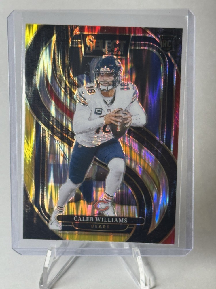 The product is a 2024 Panini Select Premier Level Caleb Williams #114 Red & Yellow Shock Prizm rookie card. This card is from the National Football League (NFL) and features the player from the Chicago Bears. It is a highly sought-after collectible for football fans and collectors alike, showcasing a unique parallel variety with vibrant red and yellow shock prizm design. As a part of the base set, this card is a valuable addition to any sports trading card collection.