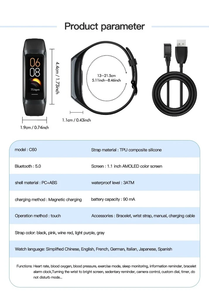 Product parameters Resolution : 126*294 Touch screen : Full touch control Battery capacity : 90mAh Charging method:Magnetic charging Waterproof:IP67 APP:Kep Health Hardware parameter Bluetooth :BLE 5.0 System version:For IOS 9.0 & above,For Android 4.4 & above Software function Step counting, calories, distance, support 24-hour timing heart rate/blood pressure/blood oxygen monitoring, sleep monitoring Calls, emails, text messages, QQ, WeChat, WhatsApp, Facebook, Twitter, Line, Skype, Instagram, LinkedIn, VK, Kakao, messenger , sedentary reminder, drink water reminder, goal reminder, low battery reminder, alarm clock, custom dial, do not disturb mode, flip wrist to brighten the screen, photo control, family health, stopwatch Sports modes walking, running, football, indoor running, hiking, cycling, yoga, dancing, roller skating, badminton, fitness, tennis, basketball, weightlifting, mountain climbing, spinning, rope skipping, push-ups, sit-ups, high-intensity training Indoor Cycling Rugby Golf Free Training Indoor Walking Language Bracelet supports languages: English, German, French, Spanish, Japanese, Chinese, Italian, Traditional Chinese, Russian, Dutch After receive the watch ,please charging first.Because after a long period of logistics, the watch has a low battery.Before using, scan the QR code on the manual to download the app and connect it to the watch with APP