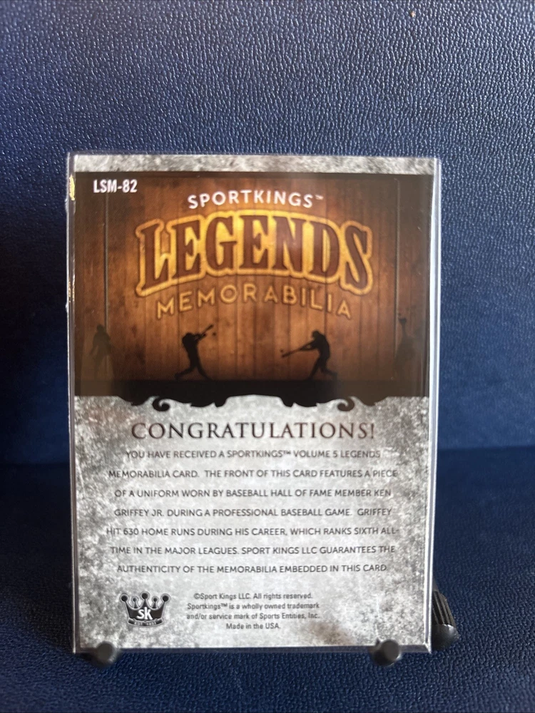Capture a piece of baseball history with the 2024 Sports Kings Volume 5 Ken Griffey Jr Game Worn Jersey LSM-82 card. Celebrate the legacy of one of the Seattle Mariners' greatest icons, Ken Griffey Jr, with this highly sought-after collectible. This card features an authentic piece of game-worn jersey, making it a must-have for any true baseball aficionado or collector. Crafted from premium card stock, this trading card is a tribute to the MLB World Series season of 2024. While it remains ungraded, its pristine nature ensures it is a quality addition to any collection. Relive the glory of the diamond and add a remarkable piece to your sports memorabilia with this original piece of baseball history.
