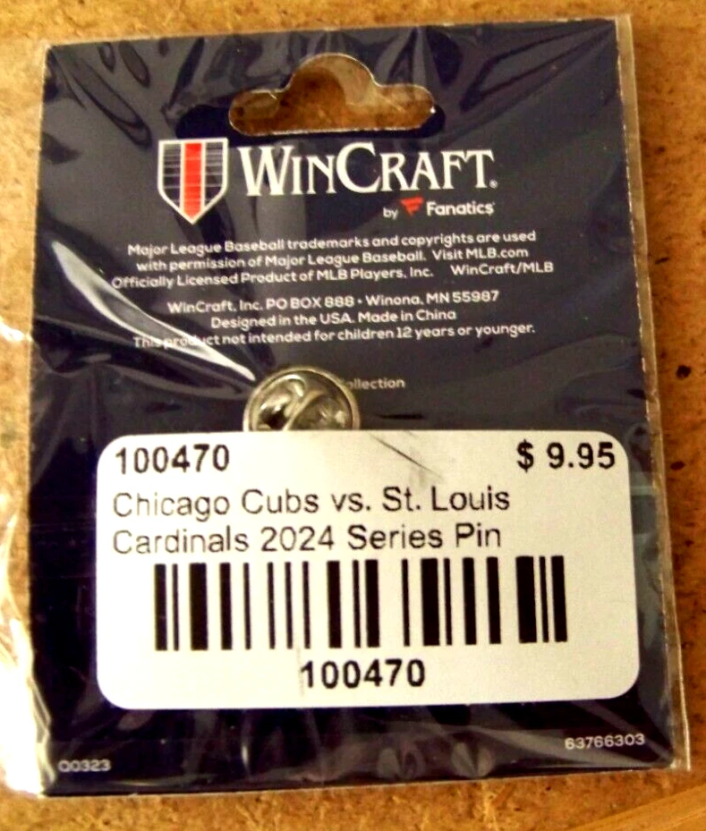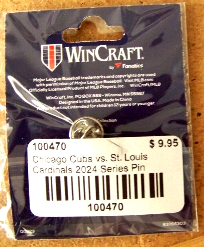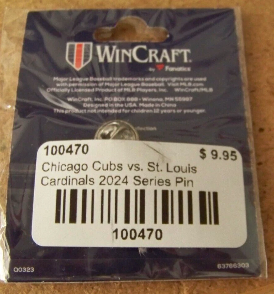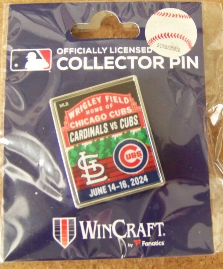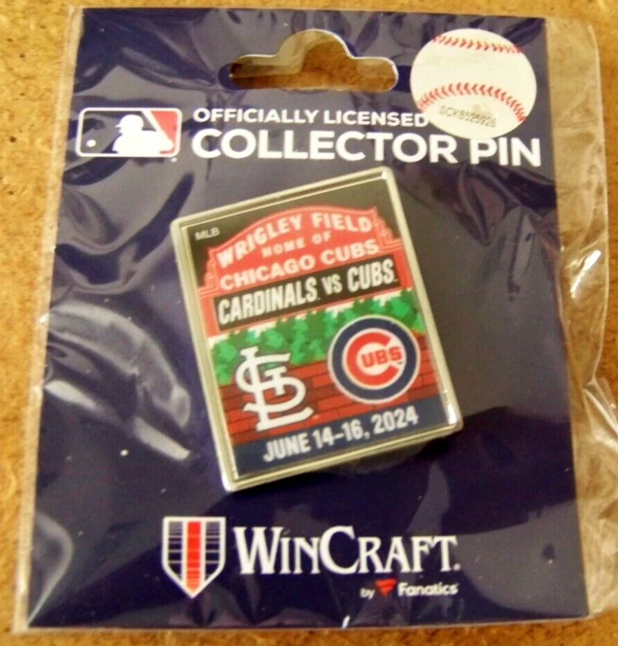 2024 St Louis Cardinals at Chicago Cubs Wrigley Field lapel pin This MLB licensed, post and butterfly clip backed lapel pin measures about 1" wide, 1.3" tall. Factory sealed, unopened. Don’t forget to click on my "Stores" link, next to my eBay name, to see other items I currently have listed for sale, or you can copy and paste this address into your browser: stores.ebay.com/highcountrycollectibles SHIPPING INFORMATION Shipping to U.S. addresses is FREE! HIGH COUNTRY COLLECTIBLES Since 1989 – A LEADER IN THE DENVER SPORTS MEMORABILIA MARKET. Check out my other auctions and listings, and keep an eye out for the different, unusual, and EXCLUSIVE items available nowhere else but from High Country Collectibles.