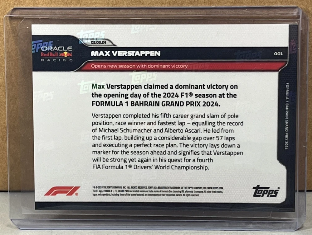 2024 TOPPS NOW FORMULA 1 F1 #1 MAX VERSTAPPEN opens new season with dominant victory. Red parallel serial #'d 30/99. Worldwide shipping available. U.S. - Winning bidder to add $4.99 for careful USPS first class shipping with delivery confirmation. Add .50 for each additional item. All other countries - ship costs are calculated by eBay through international shipping program. Please message if interested in multiple items. Bid with confidence, 49000+ feedback. Thanks and check out my auctions ending every Sunday. Please note that combined ship rates are for items paid for on one invoice, thanks!