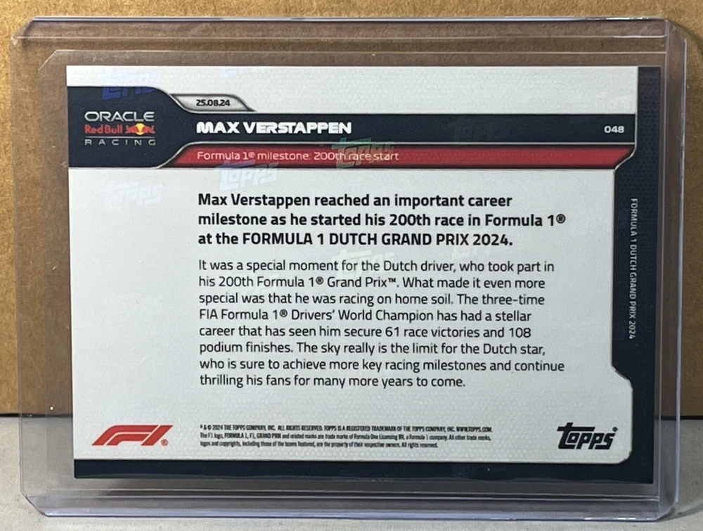 2024 TOPPS NOW FORMULA 1 F1 #48 MAX VERSTAPPEN Formula 1 milestone: 200th race start. Red parallel serial #'d 86/99. Worldwide shipping available. U.S. - Winning bidder to add $4.99 for careful USPS first class shipping with delivery confirmation. Add .50 for each additional item. All other countries - ship costs are calculated by eBay through international shipping program. Please message if interested in multiple items. Bid with confidence, 49000+ feedback. Thanks and check out my auctions ending every Sunday. Please note that combined ship rates are for items paid for on one invoice, thanks!