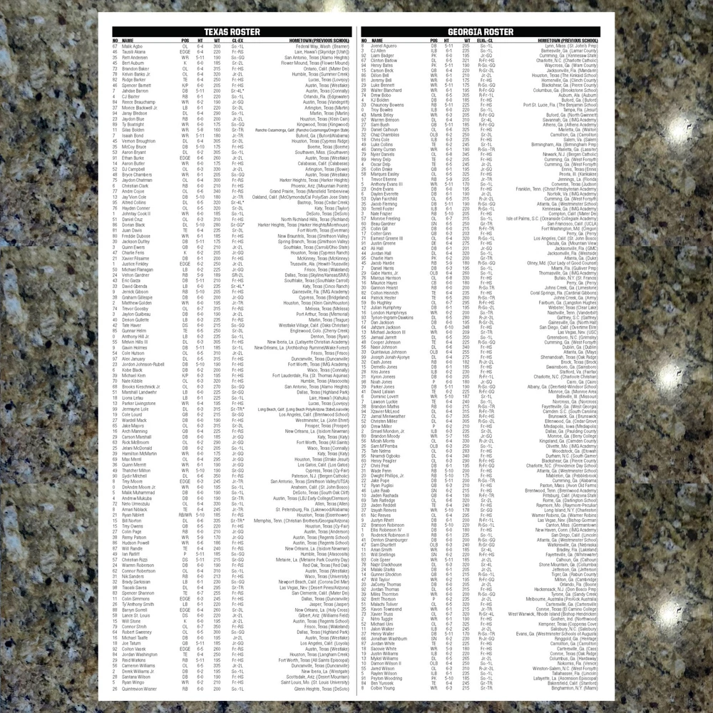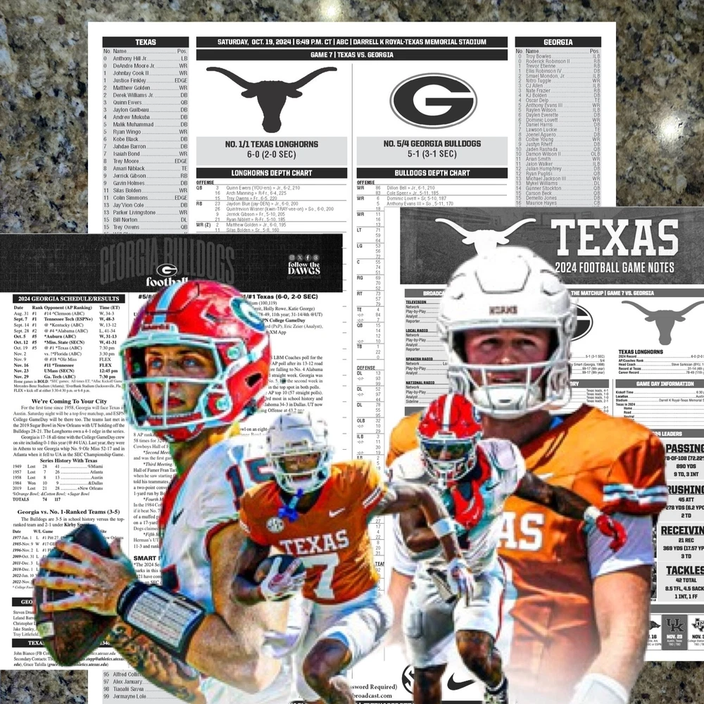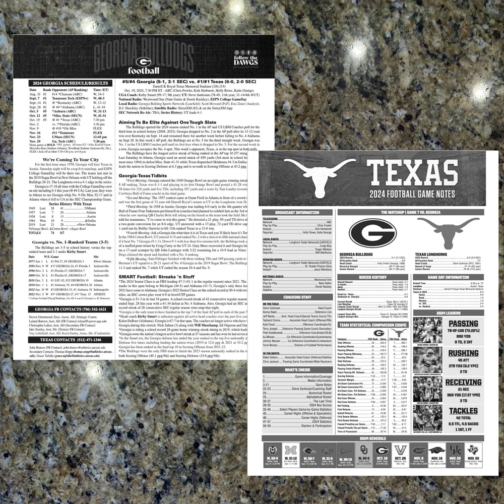 For sale, the game issued Flipcard and Media Program Notes from the SEC rivalry game Texas vs Georgia. Saturday, October 19, 2024. At Texas GAME: TEXAS VS GEORGIA DATE: SATURDAY, OCT. 19, 2024 STADIUM: DARRELL K ROYAL-TEXAS MEMORIAL STADIUM What you get: 1. 11x17 Game Issued Media Issued Flipcard - Texas vs Georgia 2. Texas Media Program Game Note (1-page) 3. Georgia Media Program Game Note (1-page) 4. Plastic protector sheet