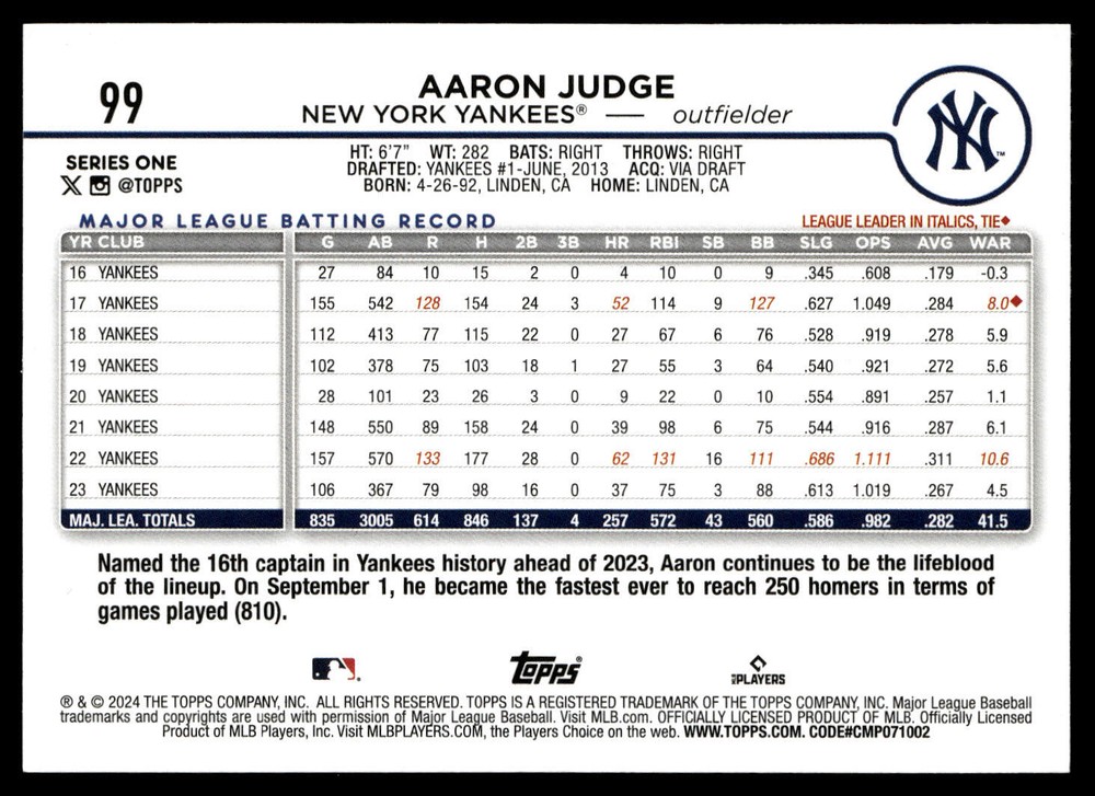 The Card pictured is the card you will receive unless there are multiple quantities then you will receive a card in the comparable grade. Cards in poor condition could have creasing, stains, rounded corners, pen marks or a combo of them. please see pics for a better understanding of cards condition. Excellent New York Yankees Aaron Judge #99 2024 Topps Topps 2024 Baseball .