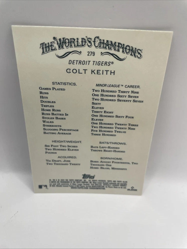 This 2024 Topps Update Series sports trading card features Colt Keith of the Major League (MLB) team Tigers. The card is an original chrome parallel variety, with a card number of 279. It is an insert card from the 2023 season, manufactured by Topps. The card is of standard size and is not autographed. The card is perfect for collectors of baseball memorabilia and fans of the Tigers. It is a great addition to any sports trading card collection. Get your hands on this 2024 Topps Allen & Ginter Colt Keith #279 Chrome Parallel RC Tigers card now! Cards are shipped via USPS shipping. Price for shipping will be Ebay Standard Envelope. If you have any questions, feel free to drop me a line before bidding. WE ACCEPT PAYPAL VERY LOW SHIPPING RATES!