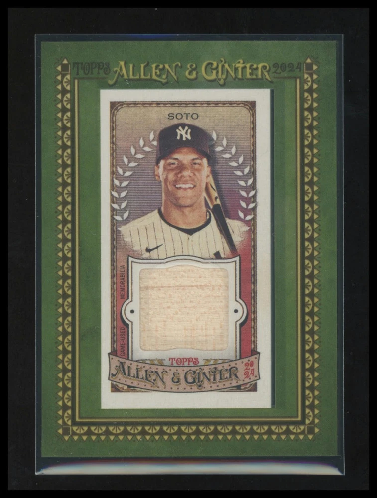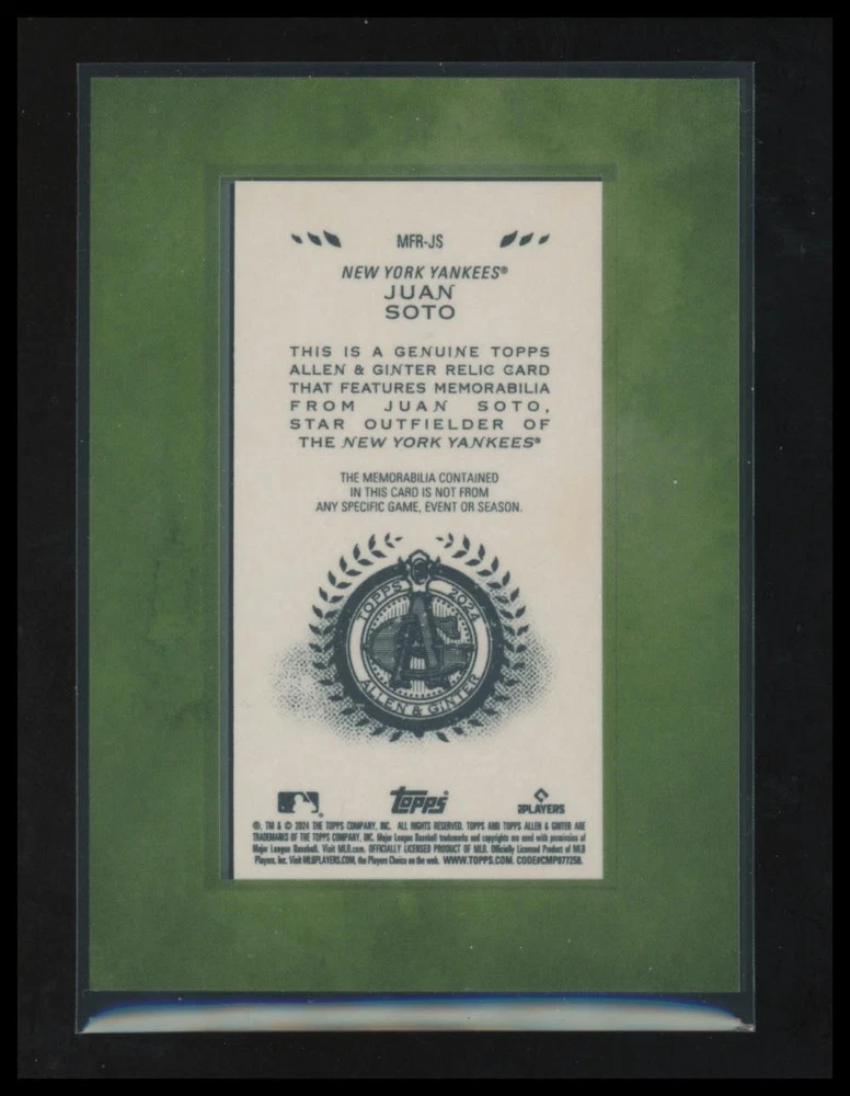 This is a nice example of a 2024 Topps Allen & Ginter #MFR-JS Juan Soto Framed Mini Relics Other important information about this card: MEM In 2024 Juan Soto played for the New York Yankees. Please check out our other listings for more great cards.