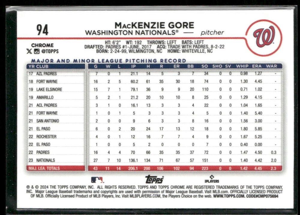 ⚾ Baseball Card featuring 2024 Topps Chrome #94 MacKenzie Gore - Washington Nationals . ⚾ 🔥 Product Details: Set: 2024 Topps Chrome Player: MacKenzie Gore Card Number: #94 Team: Washington Nationals 🌟 Key Features: Authentic baseball base card from the 2024 Topps Chrome series. Dynamic image capturing MacKenzie Gore in action for Washington Nationals. Essential for any baseball card collection. 💡 Why You'll Love It: Celebrate your favorite player and team. A foundational piece for baseball card enthusiasts. Quality craftsmanship and officially licensed. 👉 Explore my other Buy Now listings for more baseball base cards and collectibles! Please note that this advertisement is tailored for platforms such as eBay and is aimed at showcasing the key aspects of the sports card. The images included are of the actual card in question. We encourage you to closely examine these images for a detailed overview, including any blemishes or imperfections on the card. Your careful inspection will ensure a thorough understanding of the card's condition.