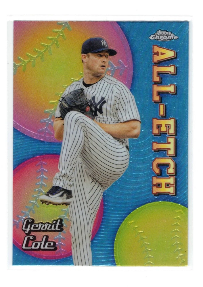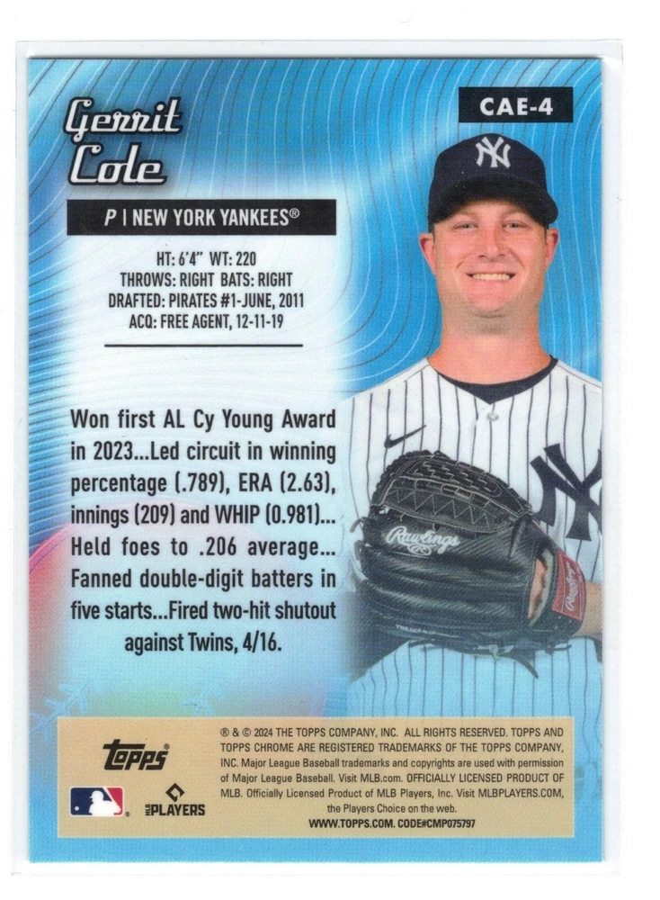 This 2024 Topps Chrome baseball card features Gerrit Cole of the New York Yankees. The card is an original and comes from the 2024 Topps Chrome set. It is an insert card with the card number CAE-4. The card is not autographed and is not a vintage or licensed reprint. The card has a unique All-Etch design that makes it stand out from other baseball cards. It is perfect for collectors and fans of the sport. Get your hands on this rare insert card and add it to your collection today! Card will ship in plain white envelope within card saver.