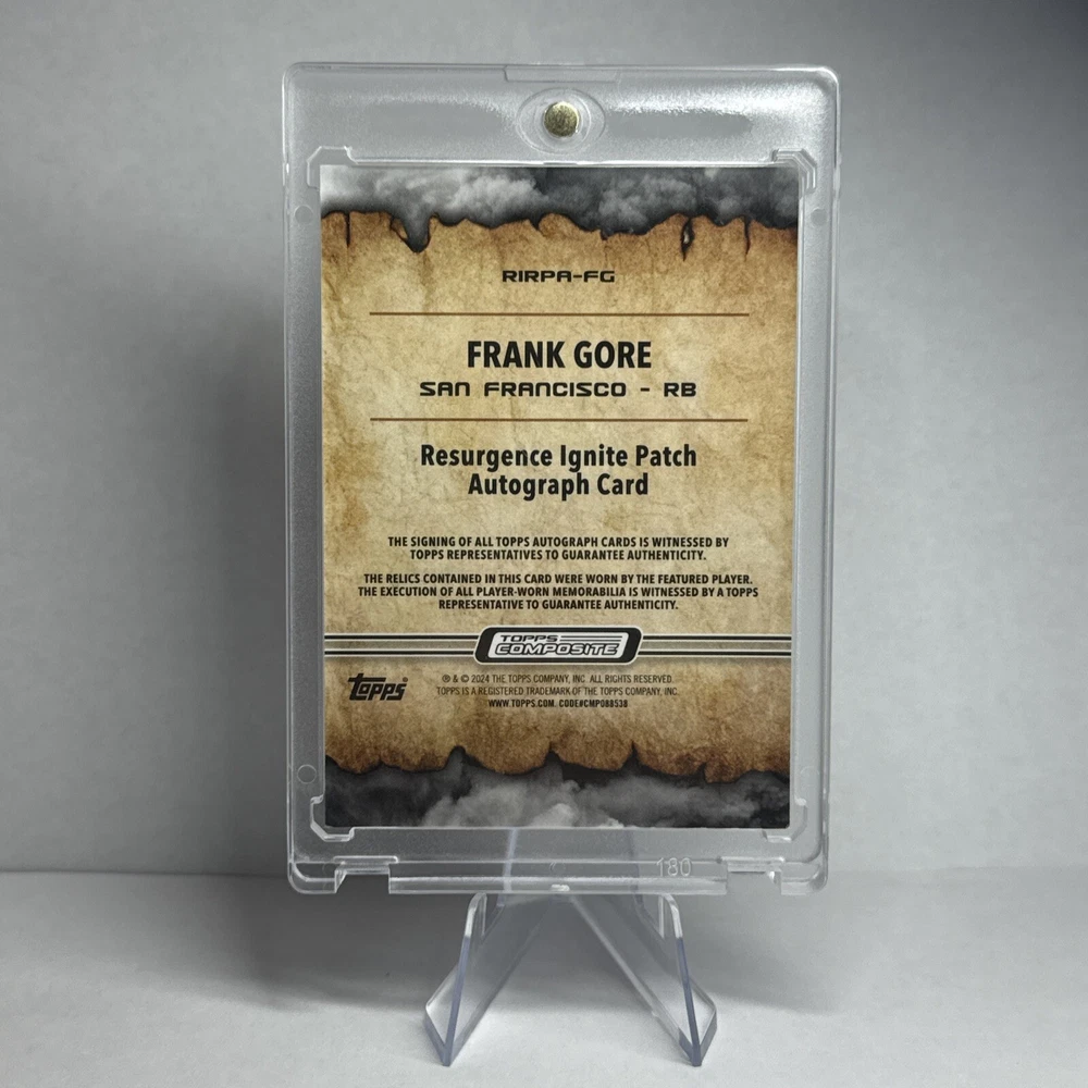 This 2024 Topps Chrome Football card features an autographed patch of Frank Gore, a former player of the San Francisco 49ers. The card is part of the Ignite collection and is serial numbered out of 149. It is a near mint or better card and has not been graded. The card is a sports trading card with a parallel/variety of patch and features an insert. It is manufactured by Topps and has the card number RIRPA-FG. The card is from the 2024 season of the National Football League (NFL) and is a must-have for collectors who are fans of Frank Gore or the San Francisco 49ers.