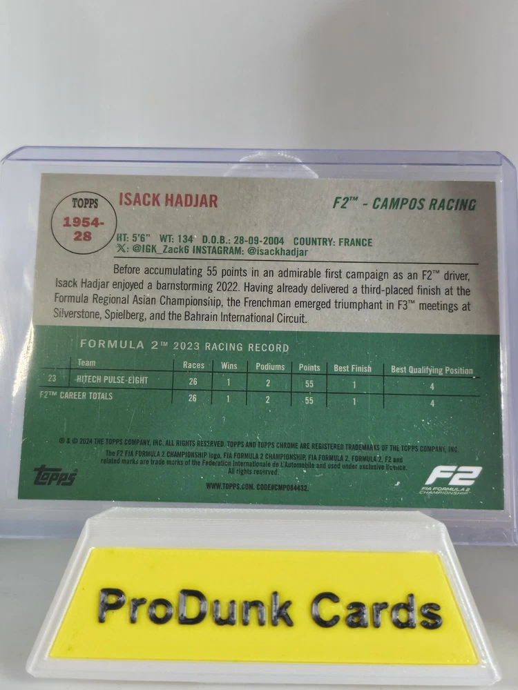 The product is a 2024 Topps Chrome Logofractor sports trading card featuring Formula 1 driver Isack Hadjar from Campos Racing. This particular card is a Gold parallel variety with a print run of 50, and it is serial numbered as 40/50. The card is part of the 2024 Topps Chrome set and is identified by card number 1954-28. It does not have an autograph and is manufactured by Topps.