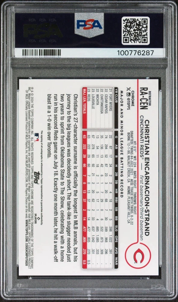 Capture a piece of baseball history with the 2024 Topps Chrome Rookie Autographs card featuring Christian Encarnacion-Strand. This coveted card, numbered at 334/499, showcases the promising talent of the Cincinnati Reds with a stunning refractor finish that catches the eye of collectors and fans alike. Autographed by Encarnacion-Strand, this card is a must-have for enthusiasts and supporters of the player. It's a wonderful addition to any baseball card collection, celebrating the 2024 season and the exciting journey of this rookie's career.