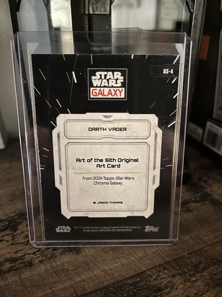 Insert Set:Art of the SithCard Number:AS-4Movie:Star WarsCharacter:Darth VaderManufacturer:ToppsCard Size:StandardMaterial:Card StockLanguage:EnglishCard Name:Darth Vader Art of the Sith Original Art CardVintage:NoConvention/Event:Star Wars CelebrationOriginal/Licensed Reprint:OriginalIllustrator:Jason ThomasFeatured Person/Artist:James Earl Jones, David ProwseYear Manufactured:2024Franchise:Star WarsCountry/Region of Manufacture:United StatesGenre:Sci-Fi, Adventure, ActionFeatures:InsertType:Non-Sport Trading CardAutographed:NoSet:Star Wars GalaxyParallel/Variety:Refractor