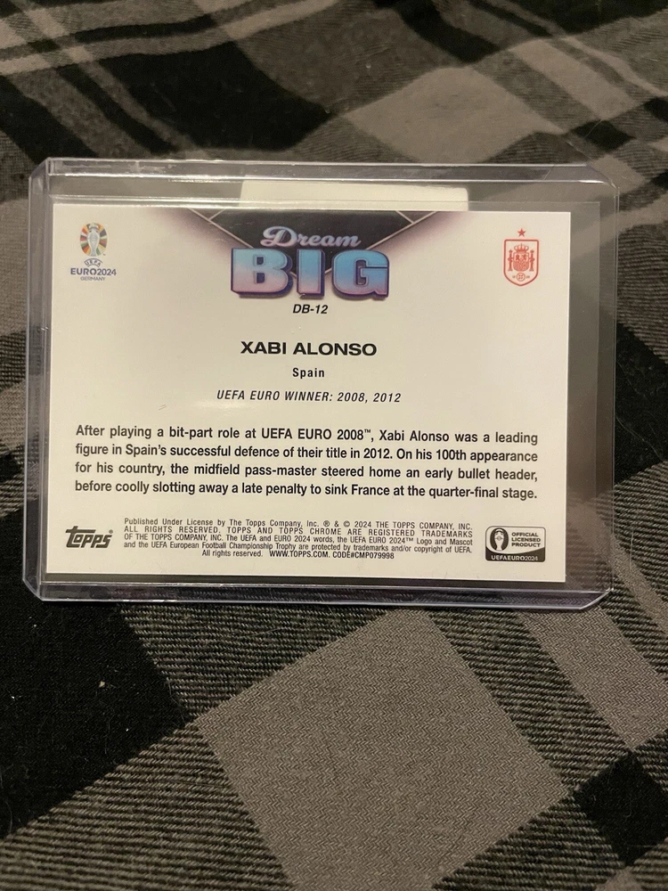 Xabi Alonso Dream Big numbered to 75. Pulled on 11/13 Card is ungraded and in perfect condition. It is also penny sleeved and top loaded in order to maintain its condition.